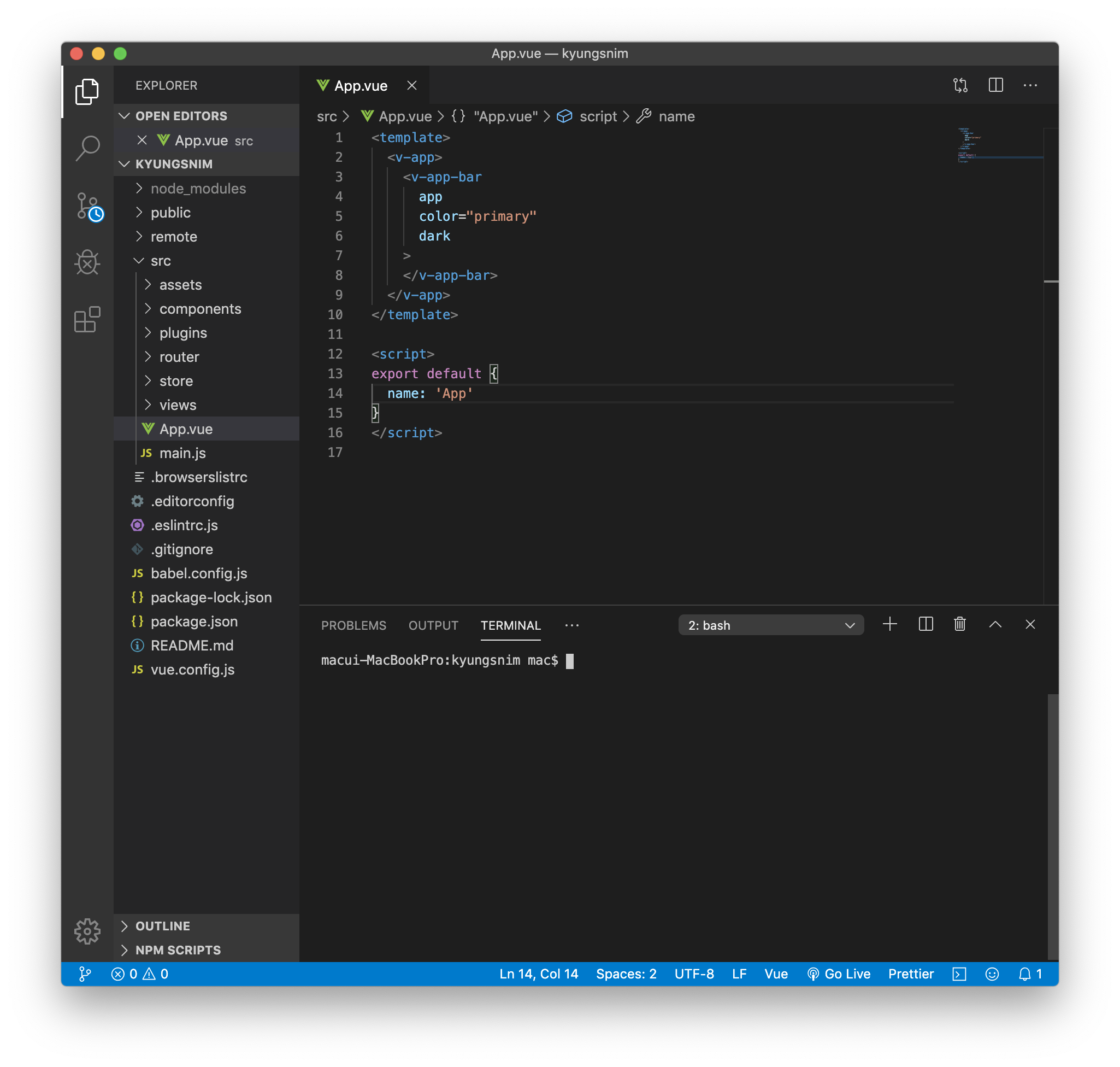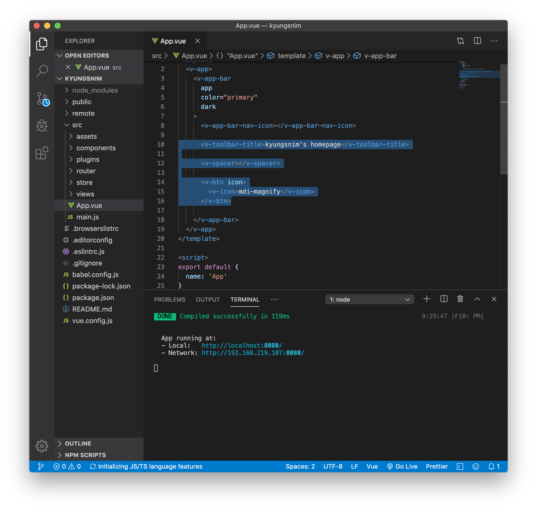 - app bar 추가하기 : vuetify에서 v-app-bar-nav-icon은 좌측 상단의 네비게이션을 위한 아이콘이다. 아래와 같이 추가해준 뒤 결과를 확인해보자.