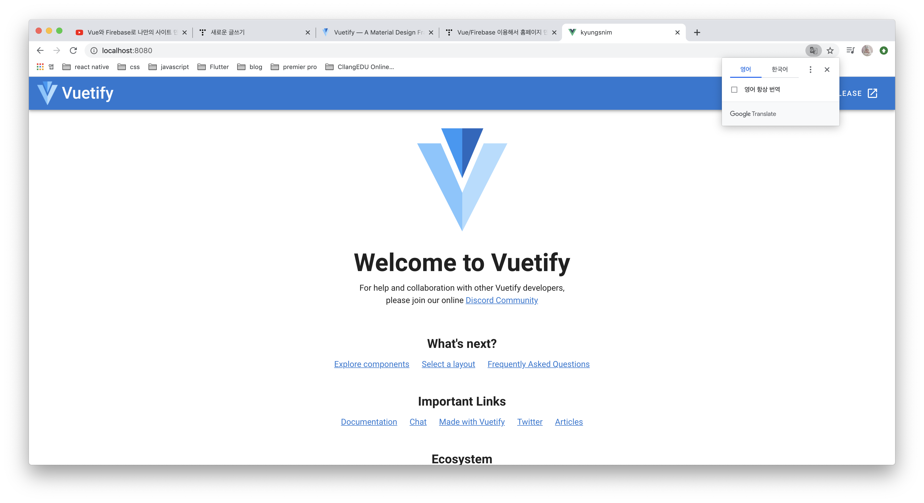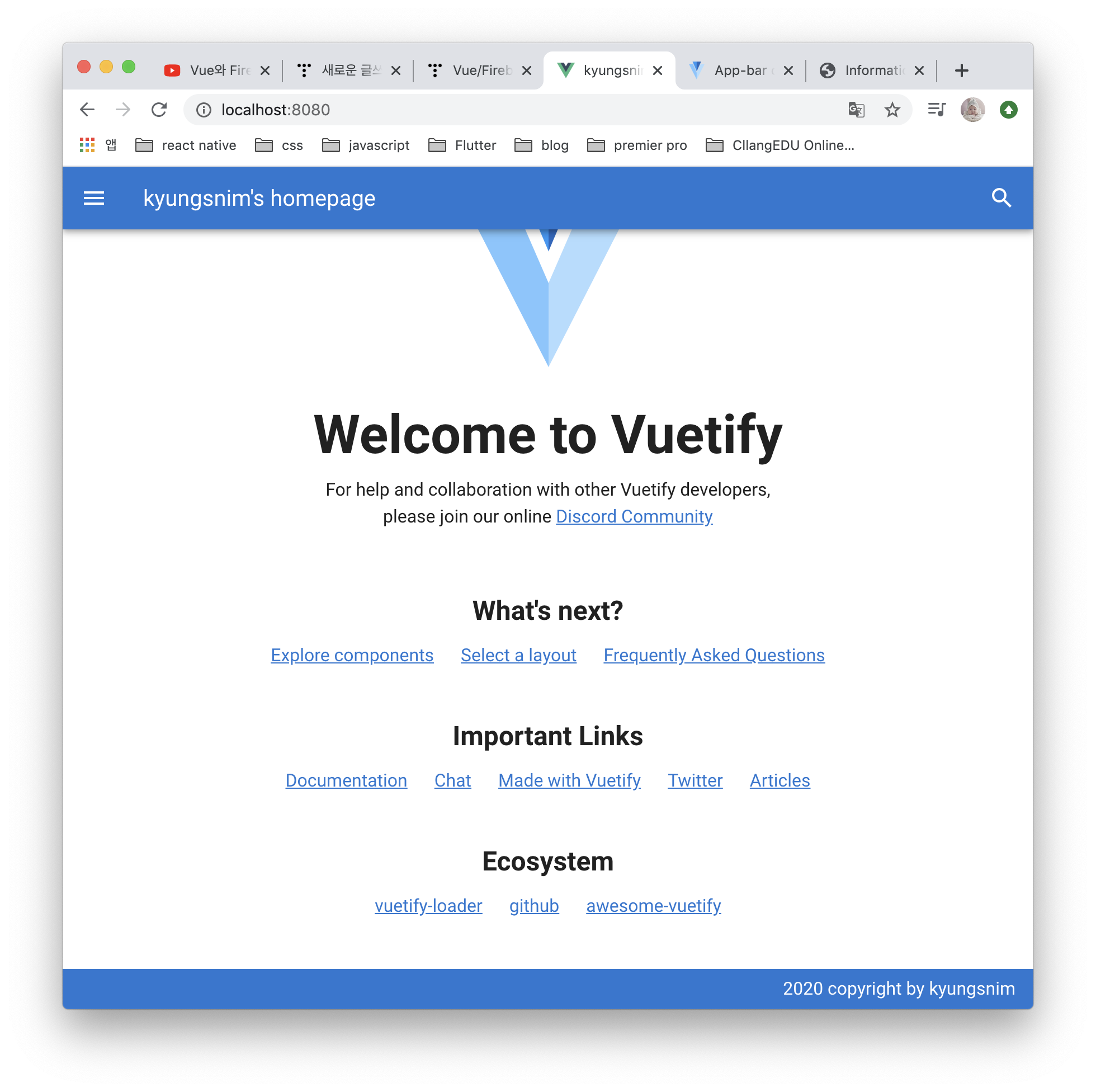 Vuetify css framework 추가한 후 기본적인 홈페이지 틀에 대해 익혀보자.