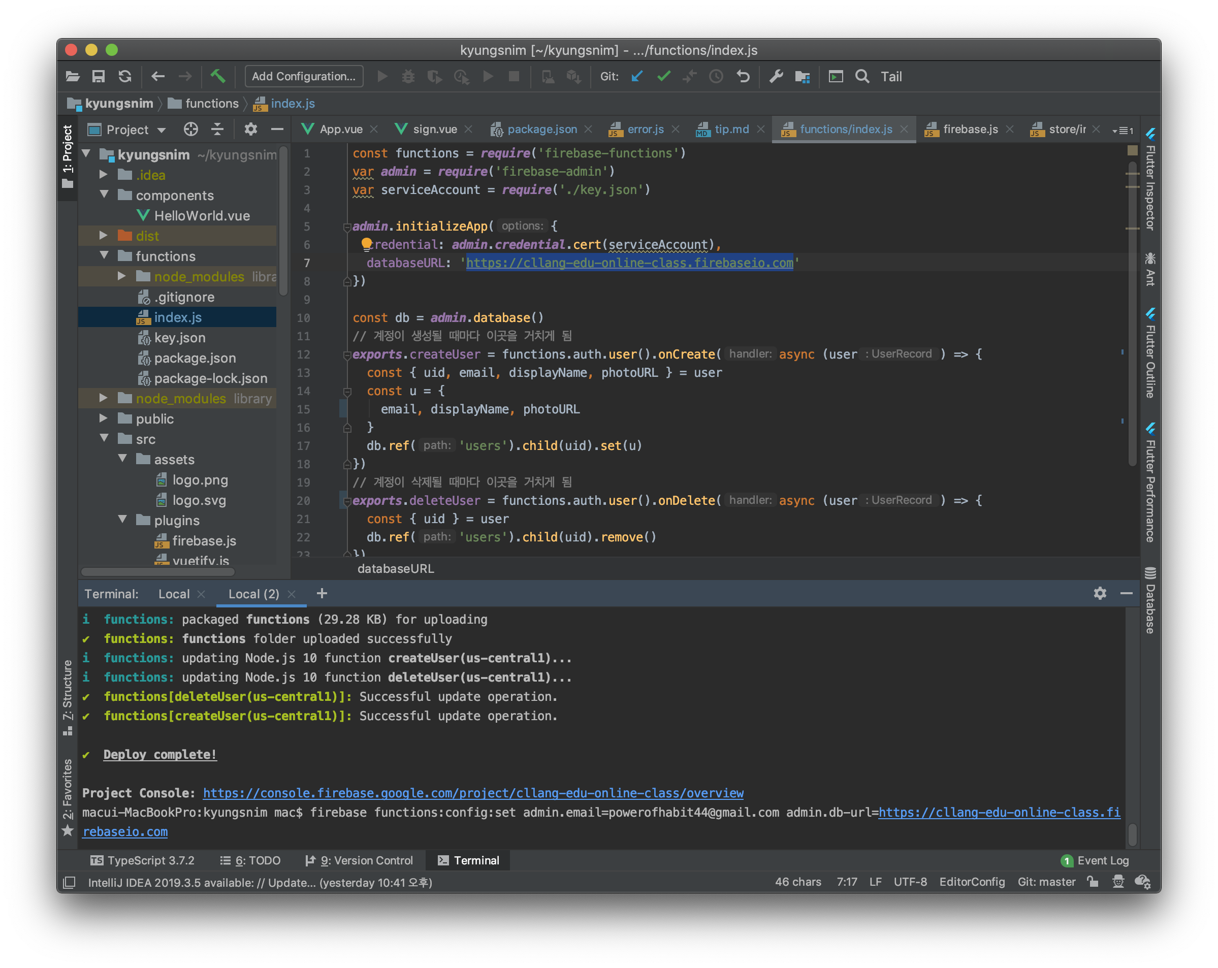 - config 설정해주기 : $ firebase functions:config:set 블라블라(이메일, db_url설정 해줌)