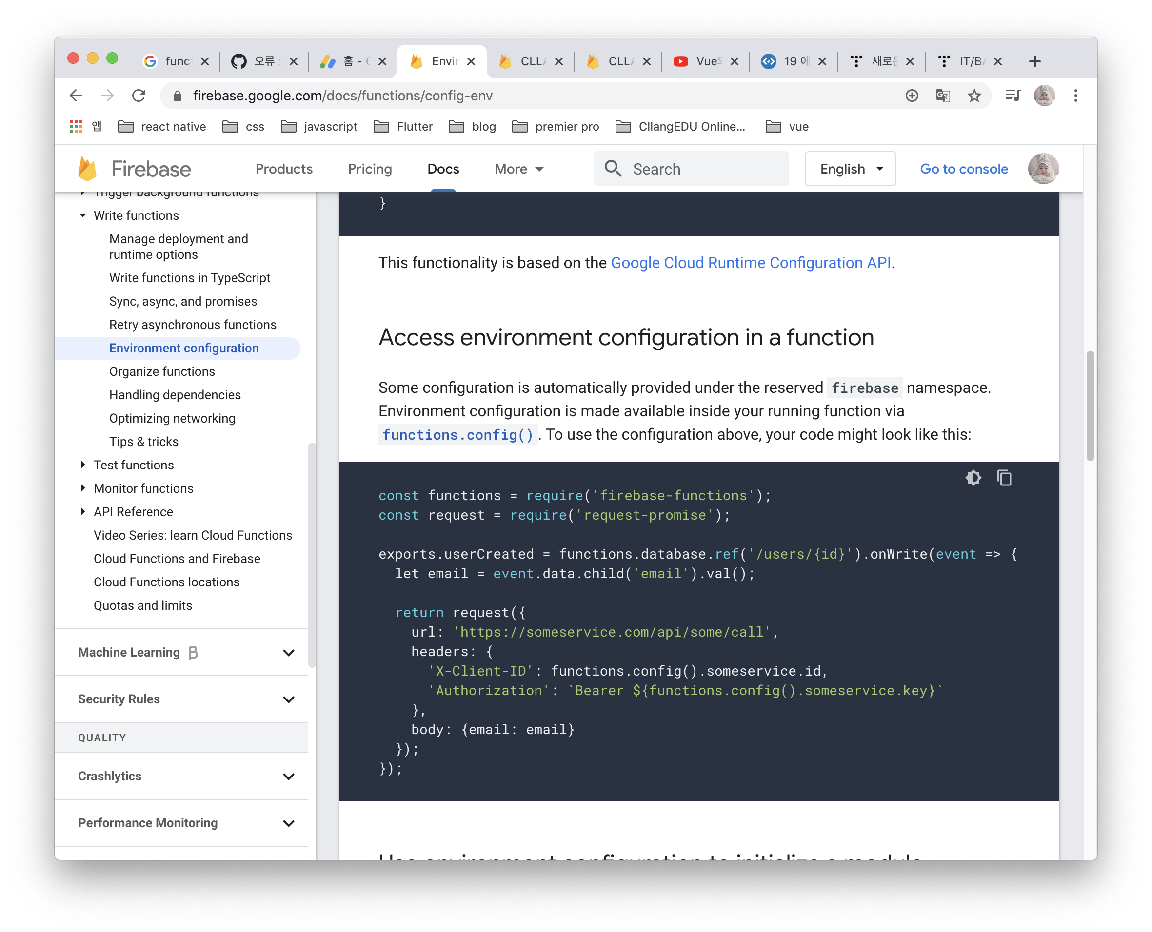 - functions 환경 설정를 위한 참고문서 : Firebase > docs > Cloud Functions > Write functions > Environment configuration