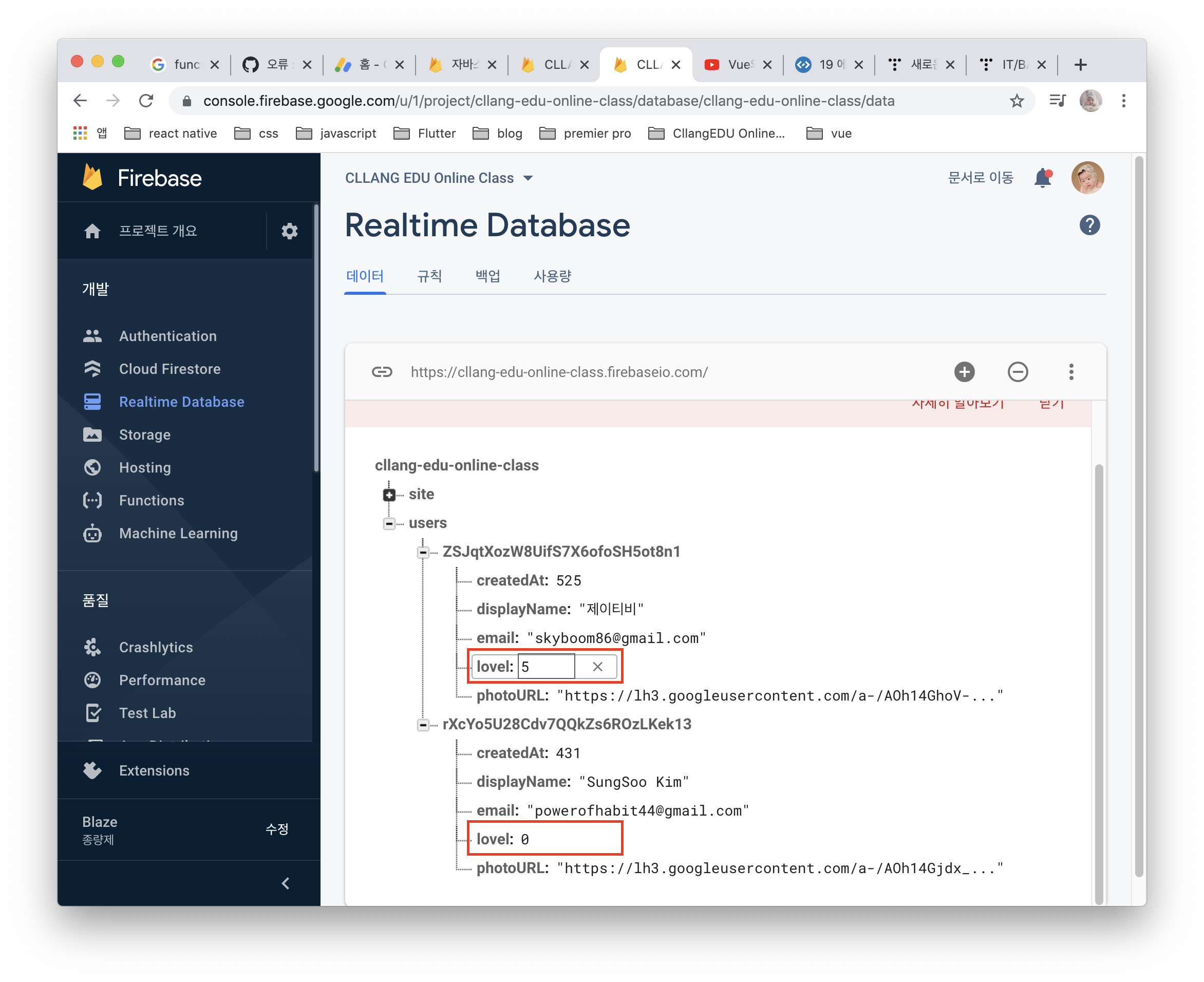 아래는 dbURL과 사용자 저장시 level 설정해줄 때 관리자 이메일인지 체크하는 부분에 추가해주었다.