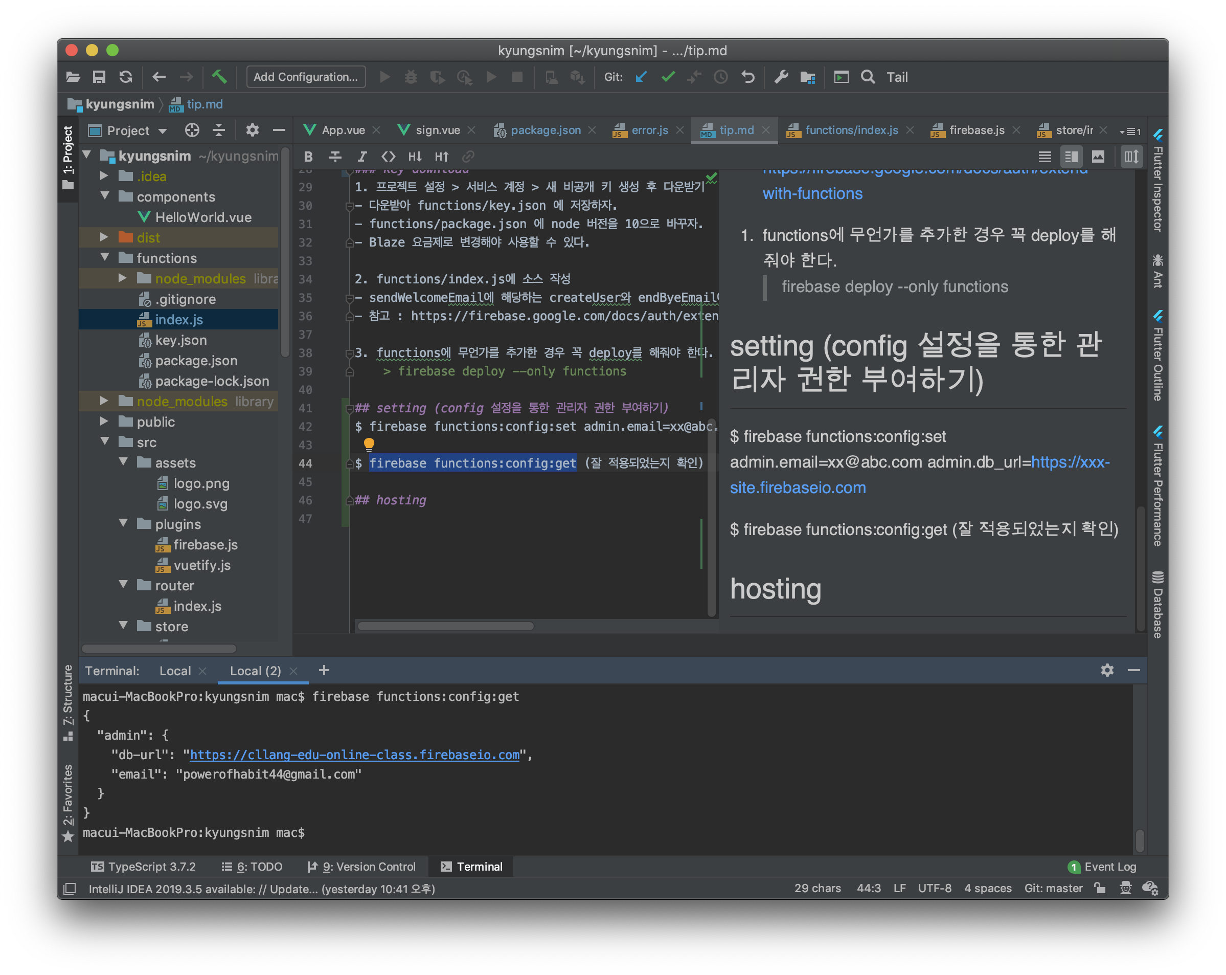 - config 설정해주기 : $ firebase functions:config:set 블라블라(이메일, db_url설정 해줌)