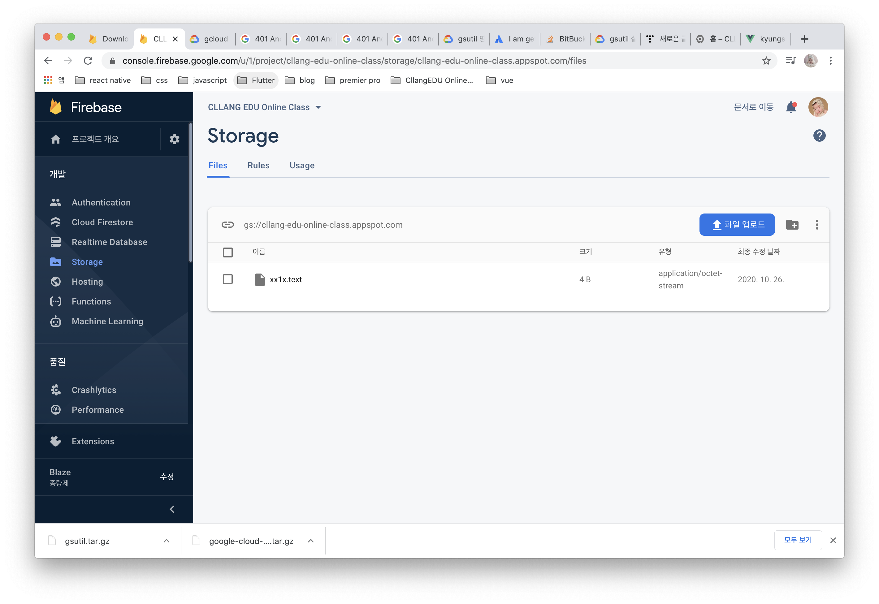 - 터미널 다시 열어 gsutil cors set cors.json gs://cllang-edu-online-class.appspot.com 입력하니 아래와 같이 뜨네...