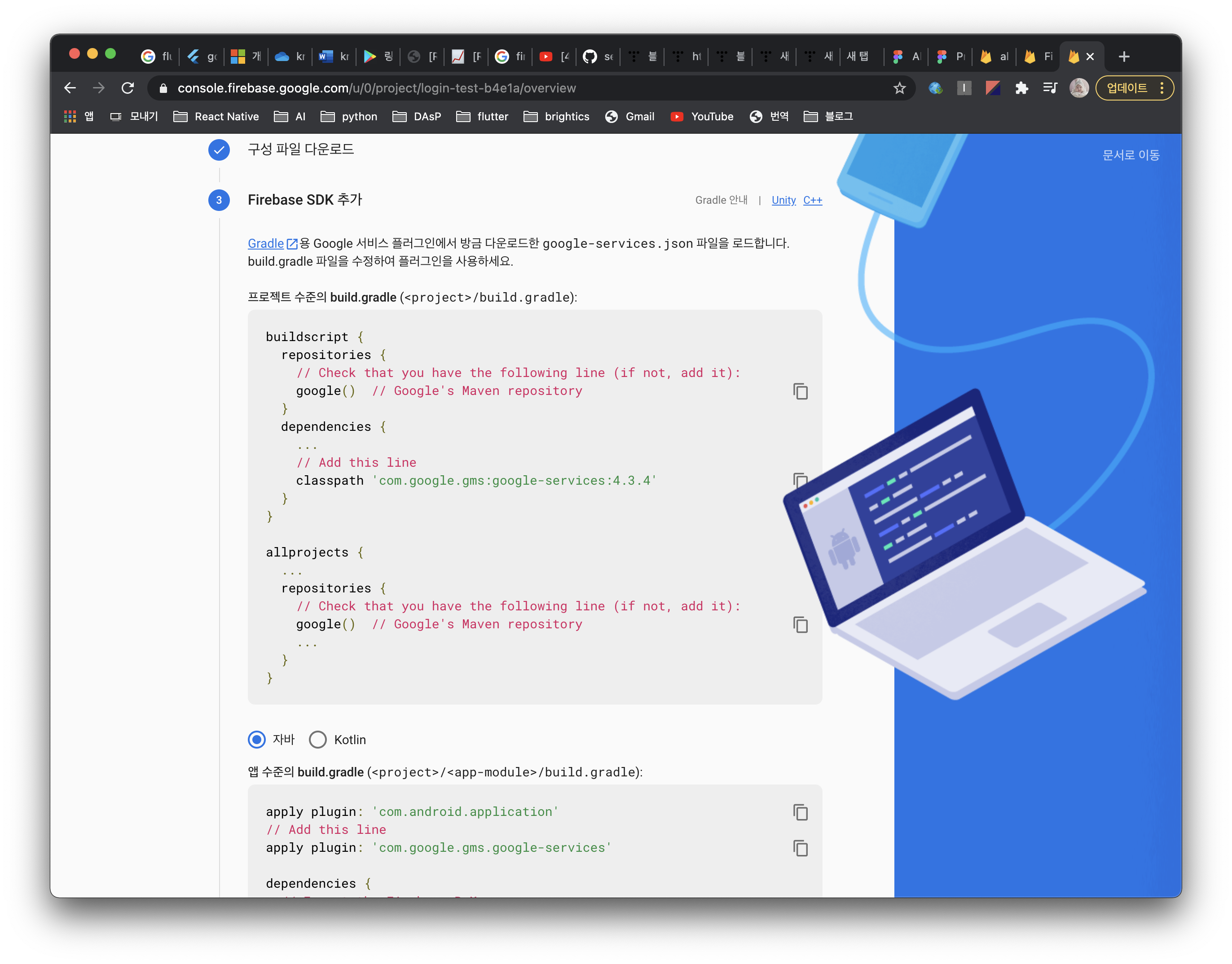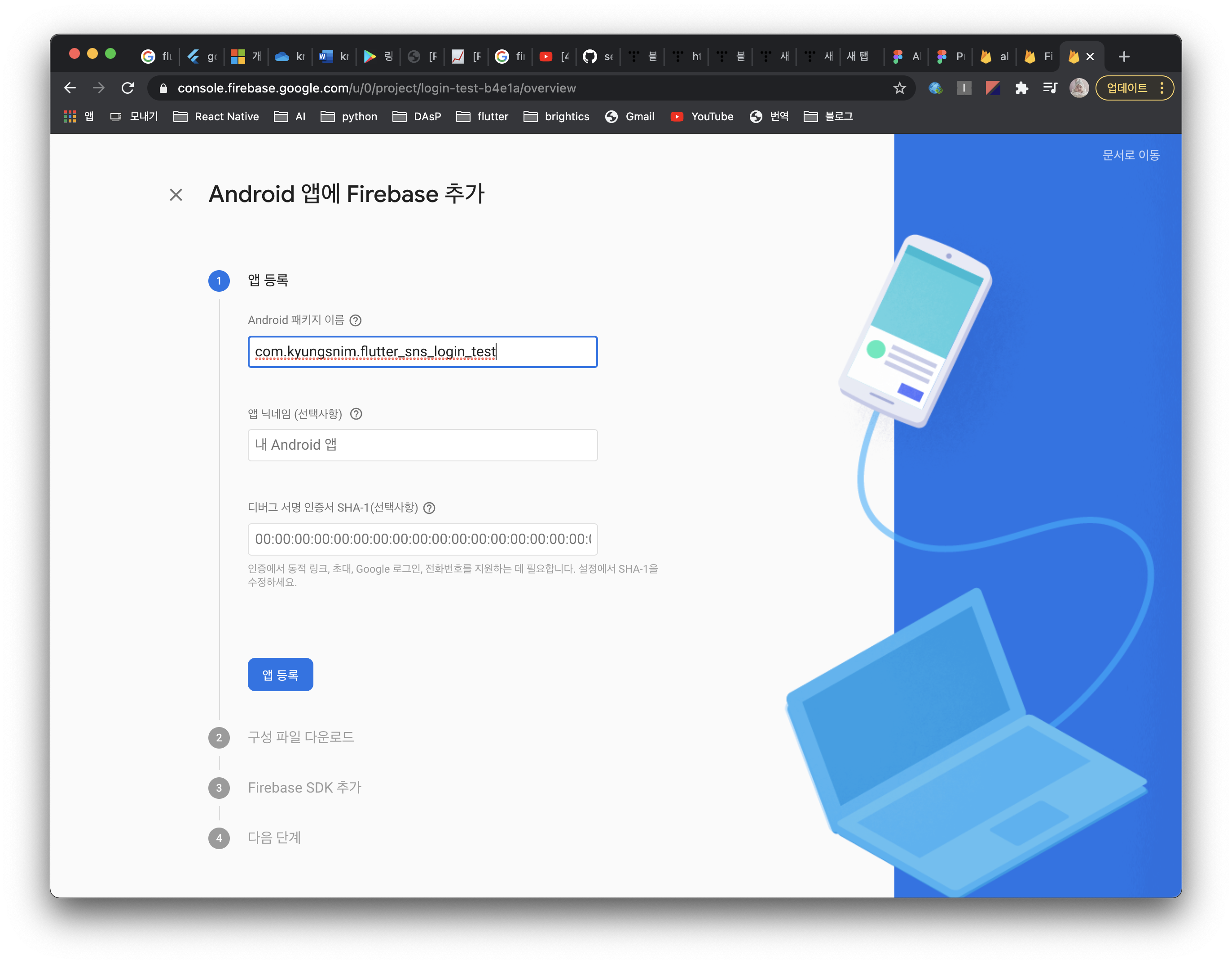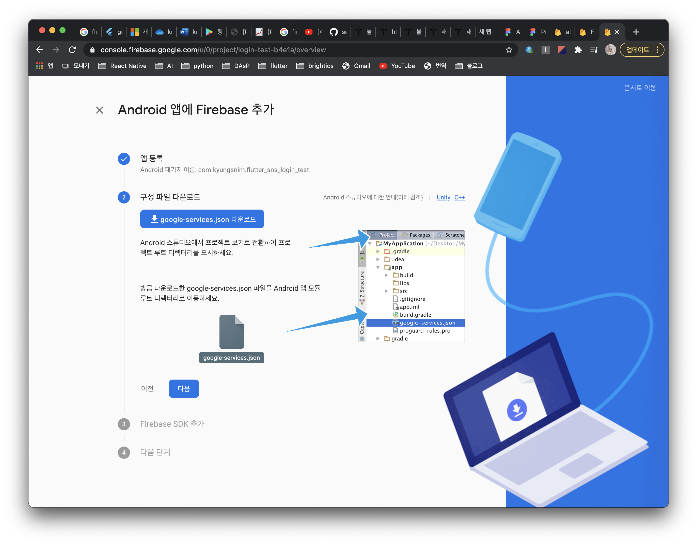- 이제 다시 firebase쪽 화면으로 넘어와 다음 단계를 진행하자.