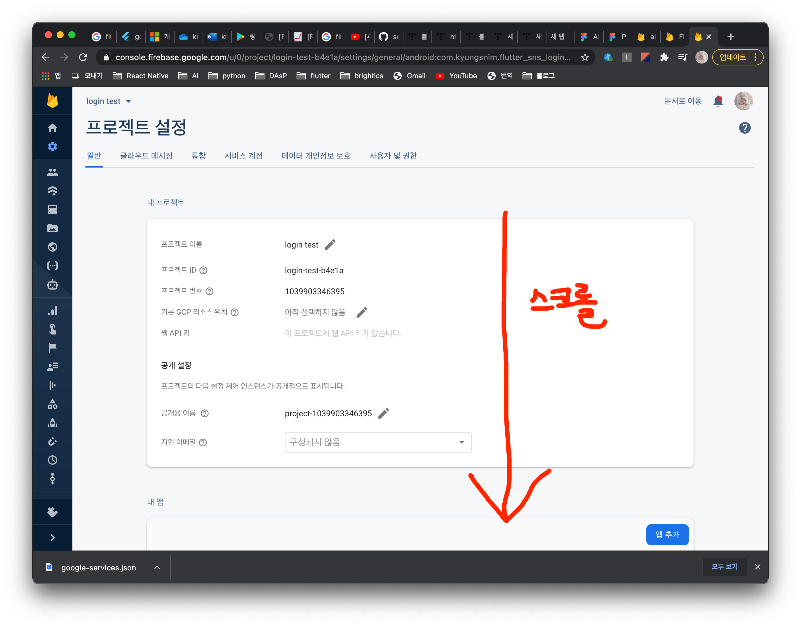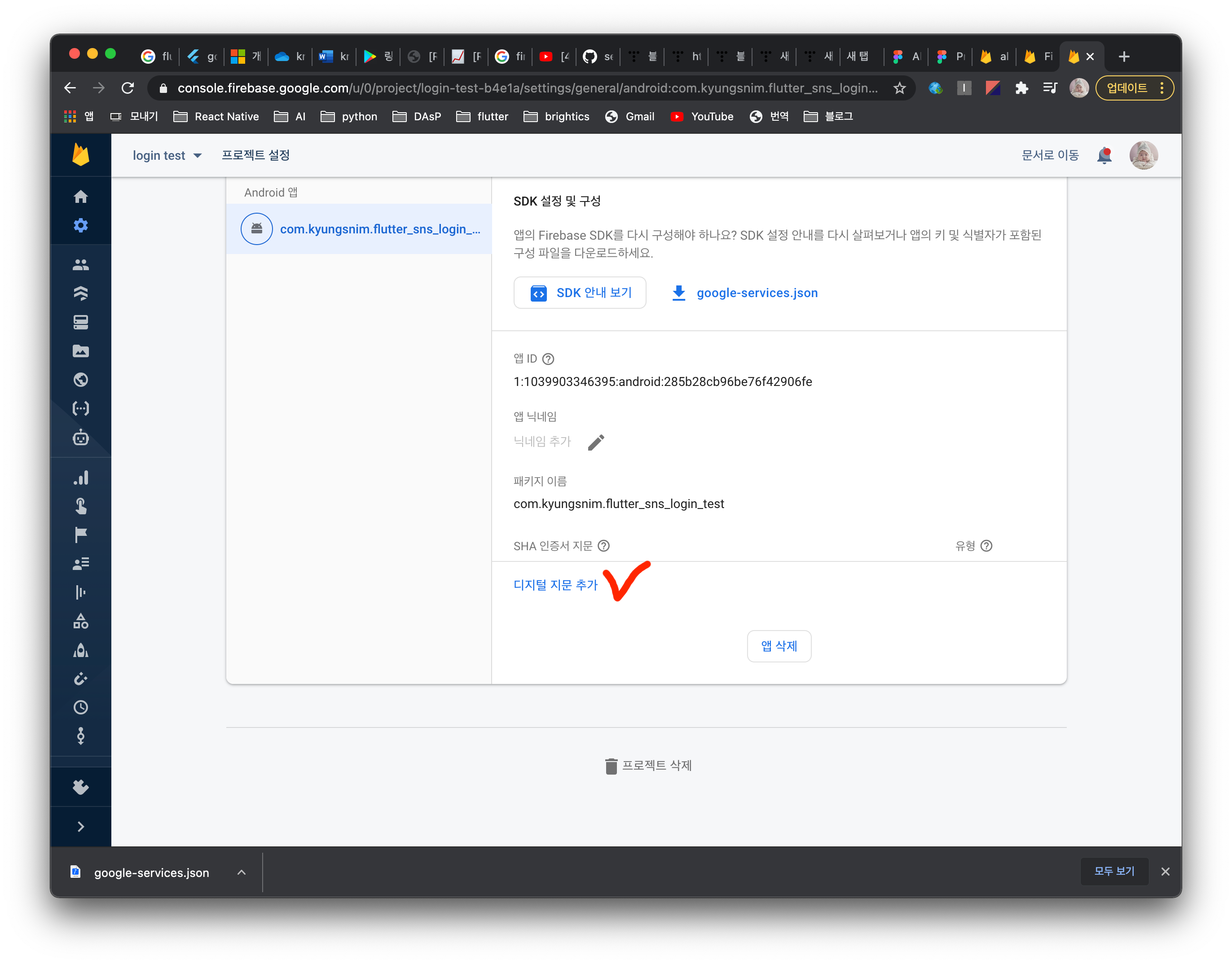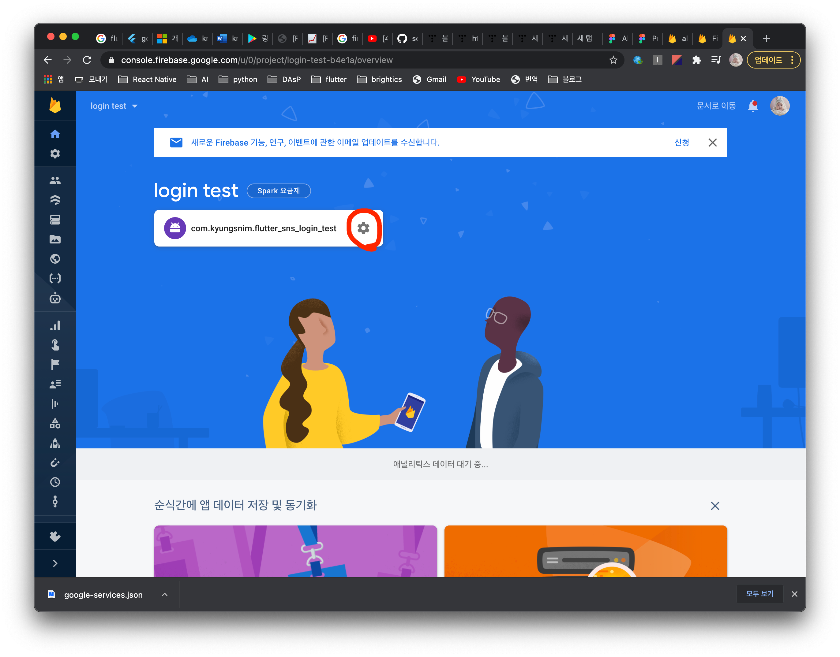 - 가장 중요한 부분이다. google-services.json 다운로드 버튼을 눌러 해당 파일을 받자
