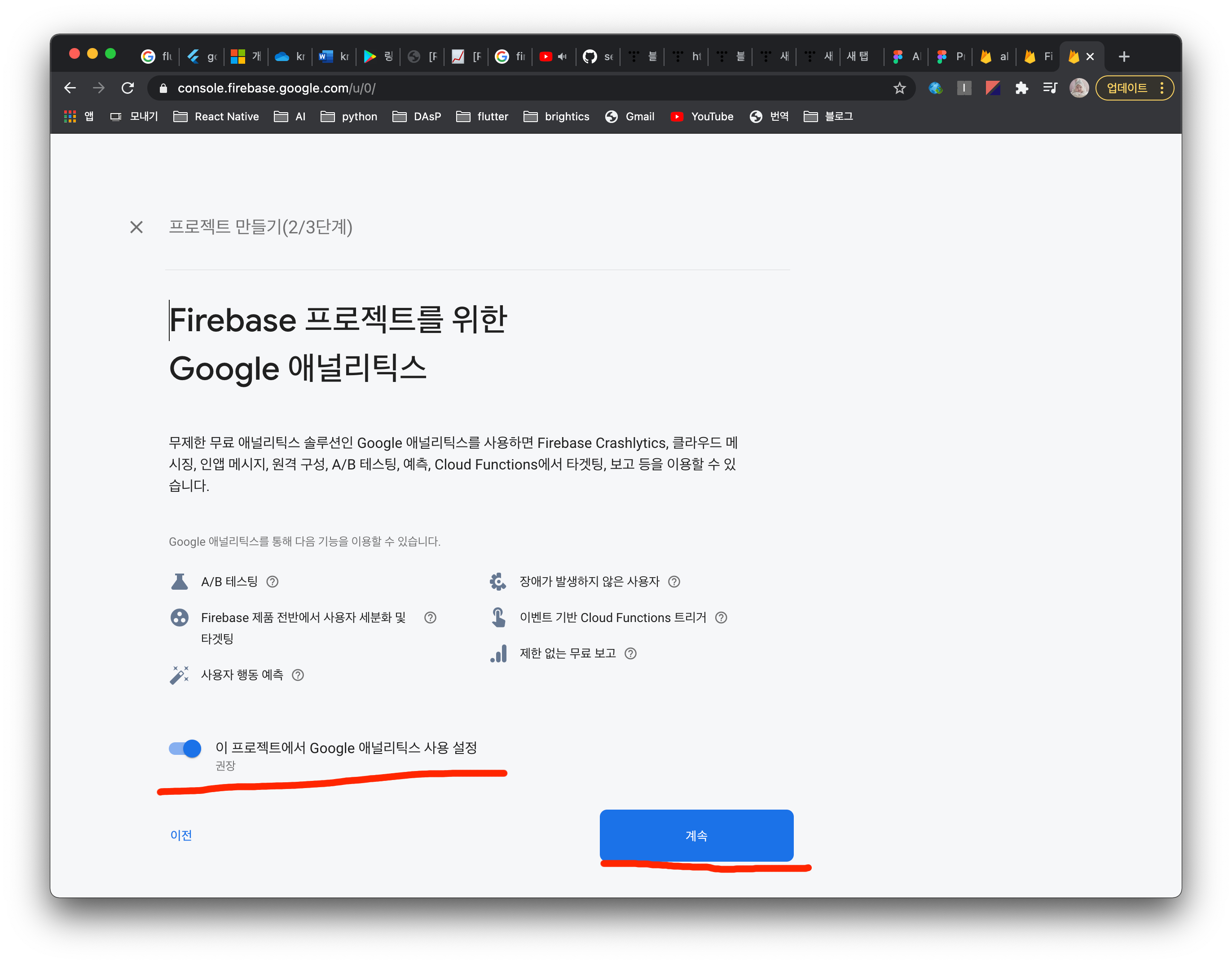 - 구글 애널리틱스는 추후에 앱의 사용자가 많아진다면 여러 도움을 받을 수 있는 도구인것 같은데, 나도 고수가 아니라서 잘 모르겠다. (예를 들어, 내 앱을 사용하는 주요 사용자의 연령대나 성별 등을 분석해주는?) 나는 우선 사용 설정은 해두는데 체크해제를 하고 계속해도 무방하다.