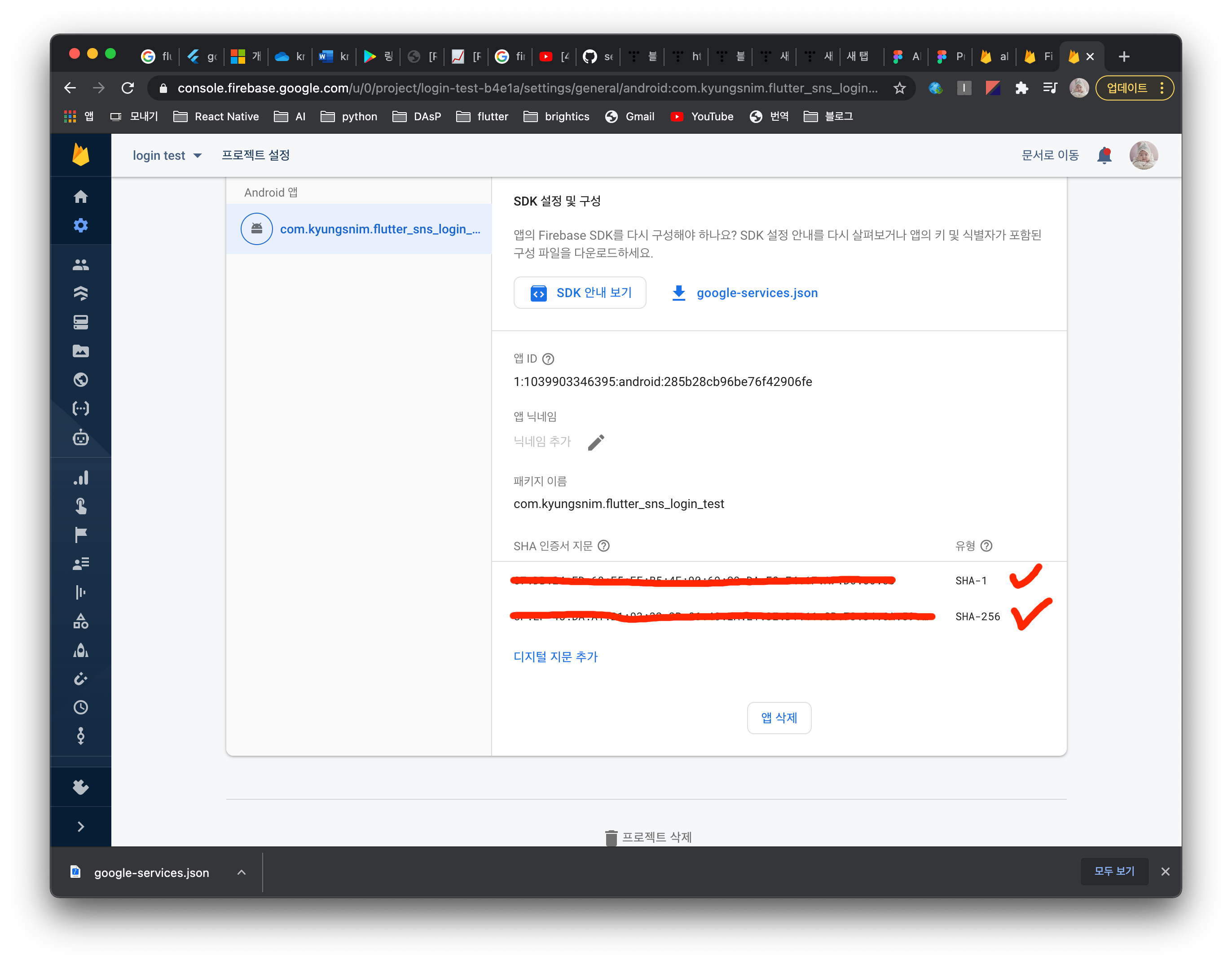 - 확인된 SHA-1 / SHA-256을 Firebase 프로젝트 내에 생성한 Android 플랫폼 설정에 추가해주자.