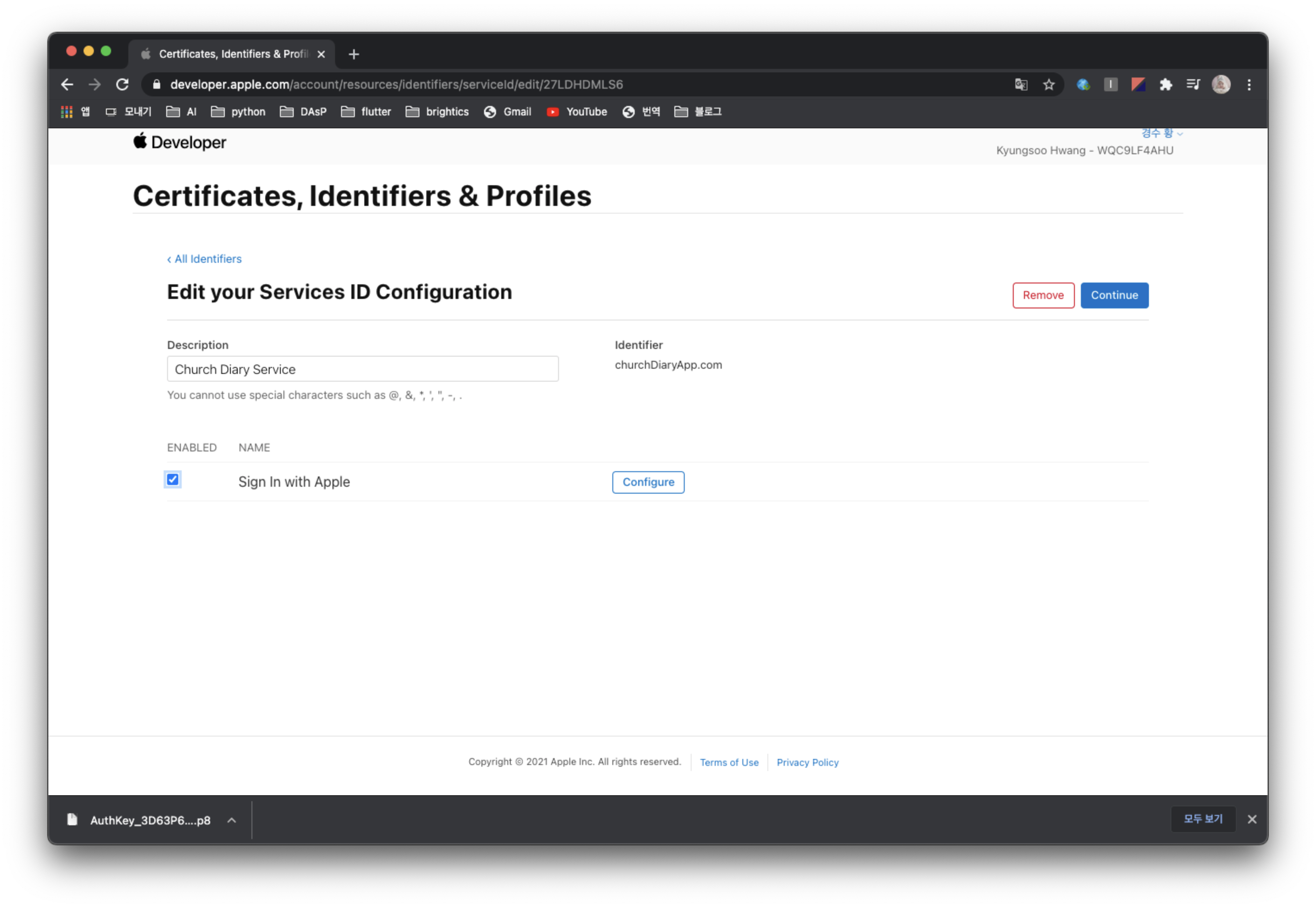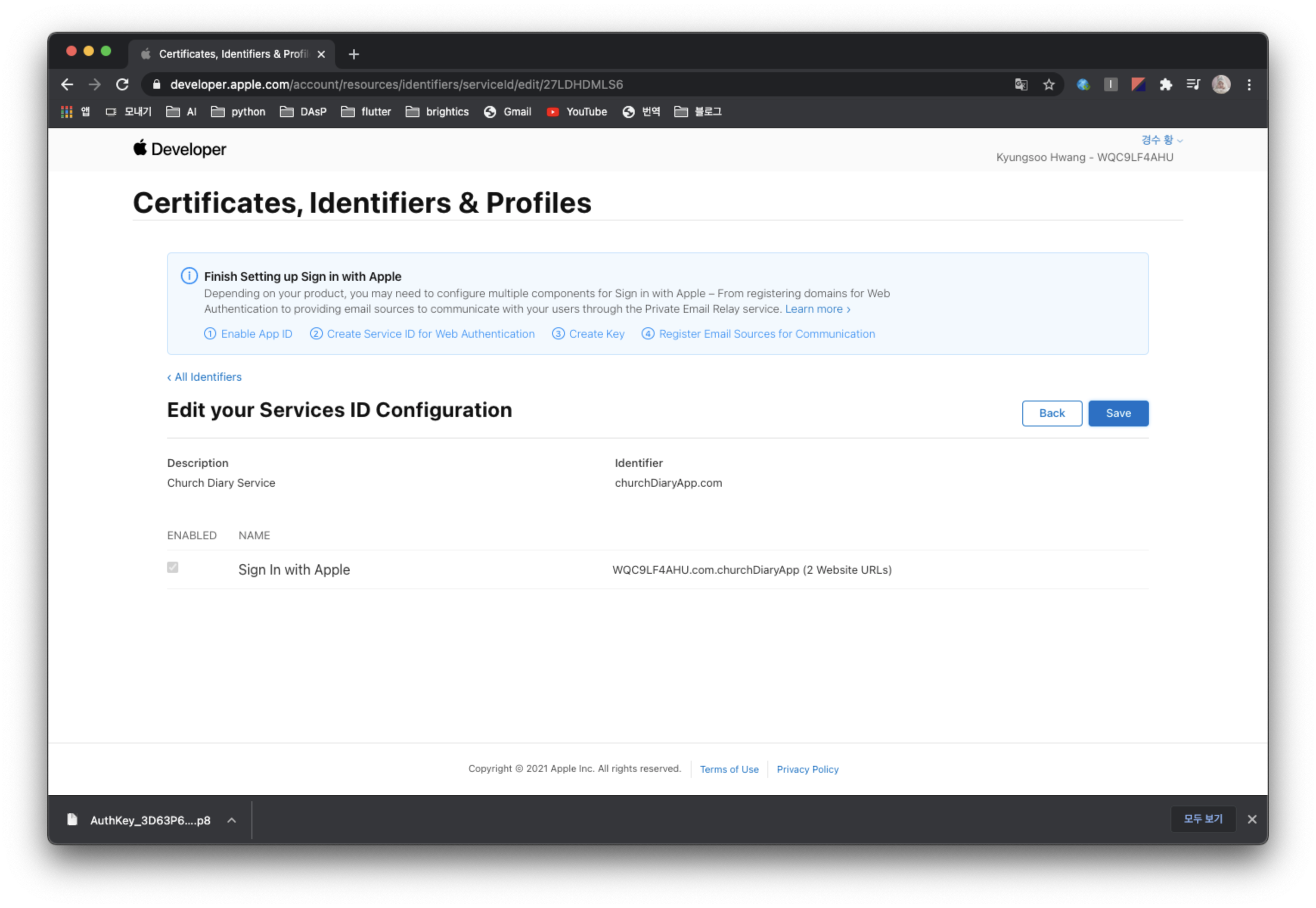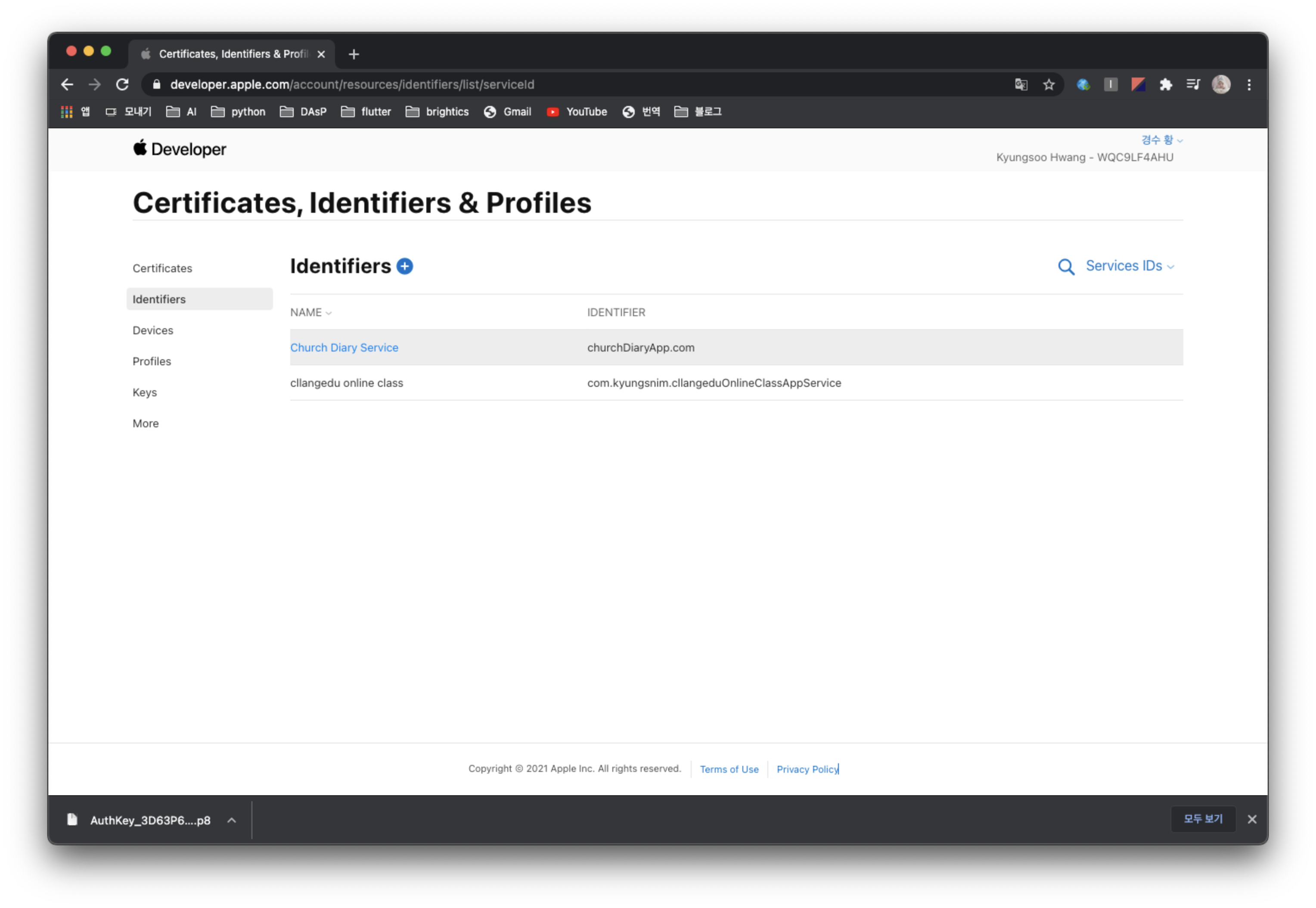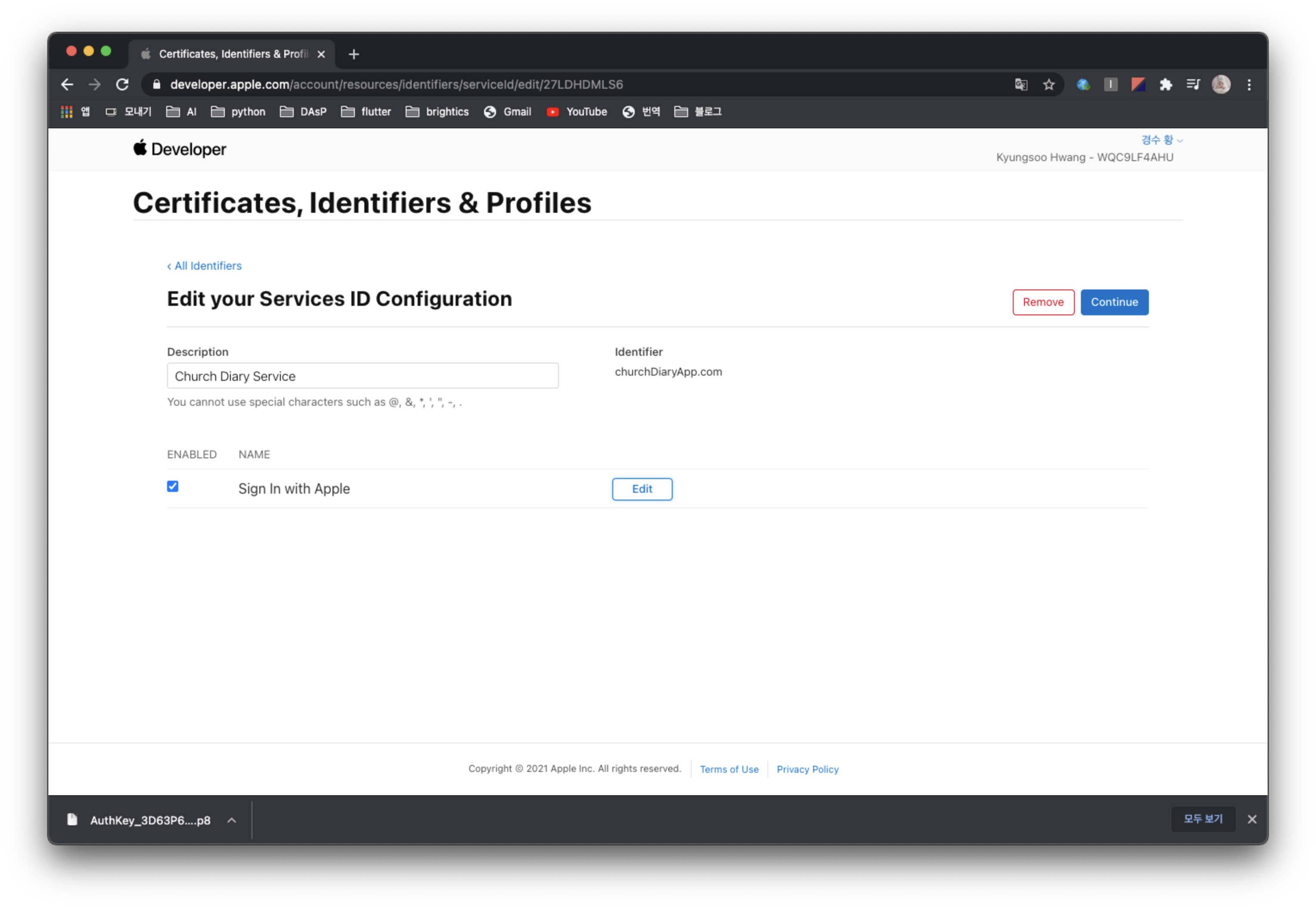 애플 개발자 사이트에 가서 애플 로그인을 수행할 앱을 등록하고, 해당 앱에서 애플 로그인을 사용하도록 Key를 생성하고 Service ID를 생성해줄 것이다.