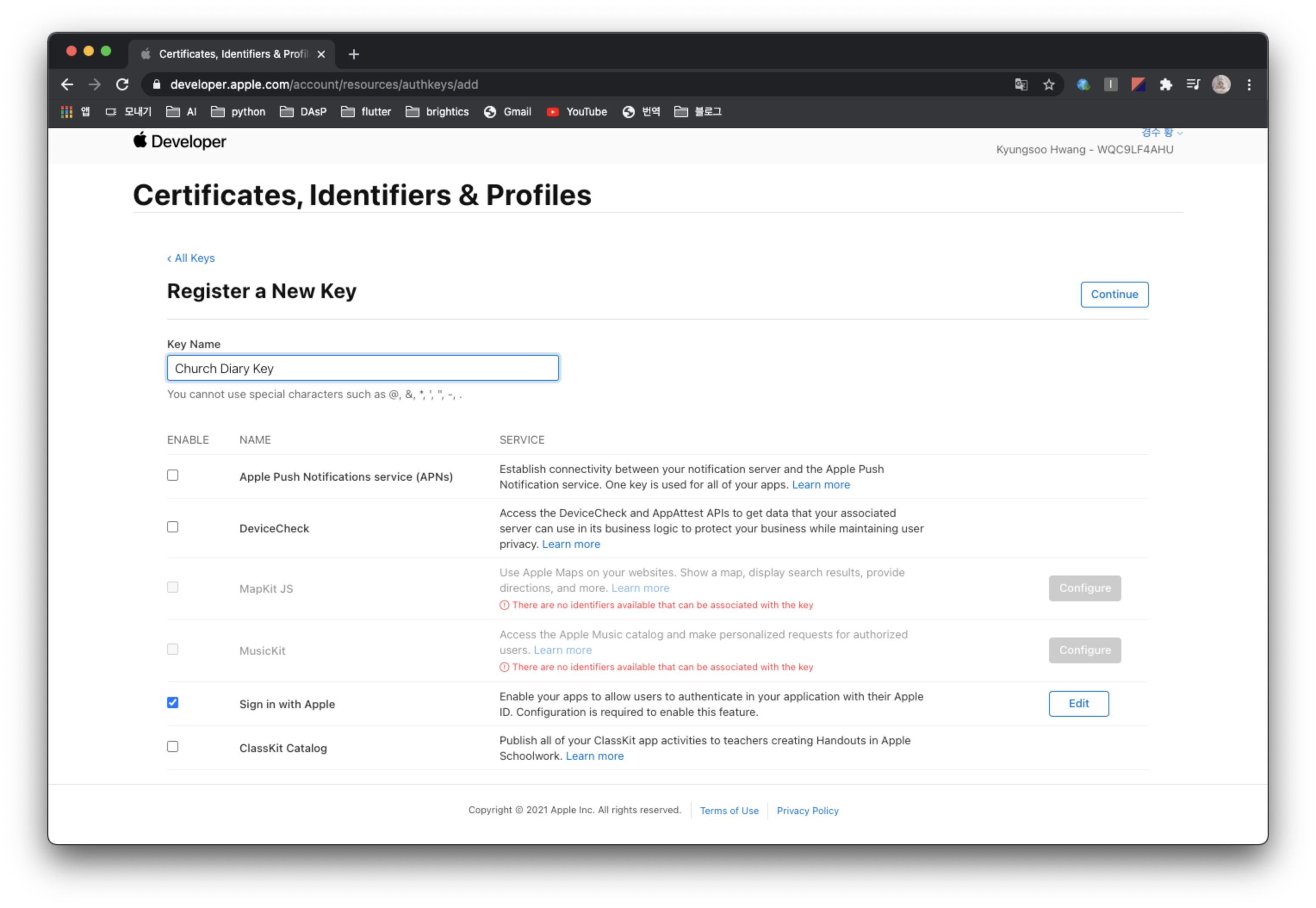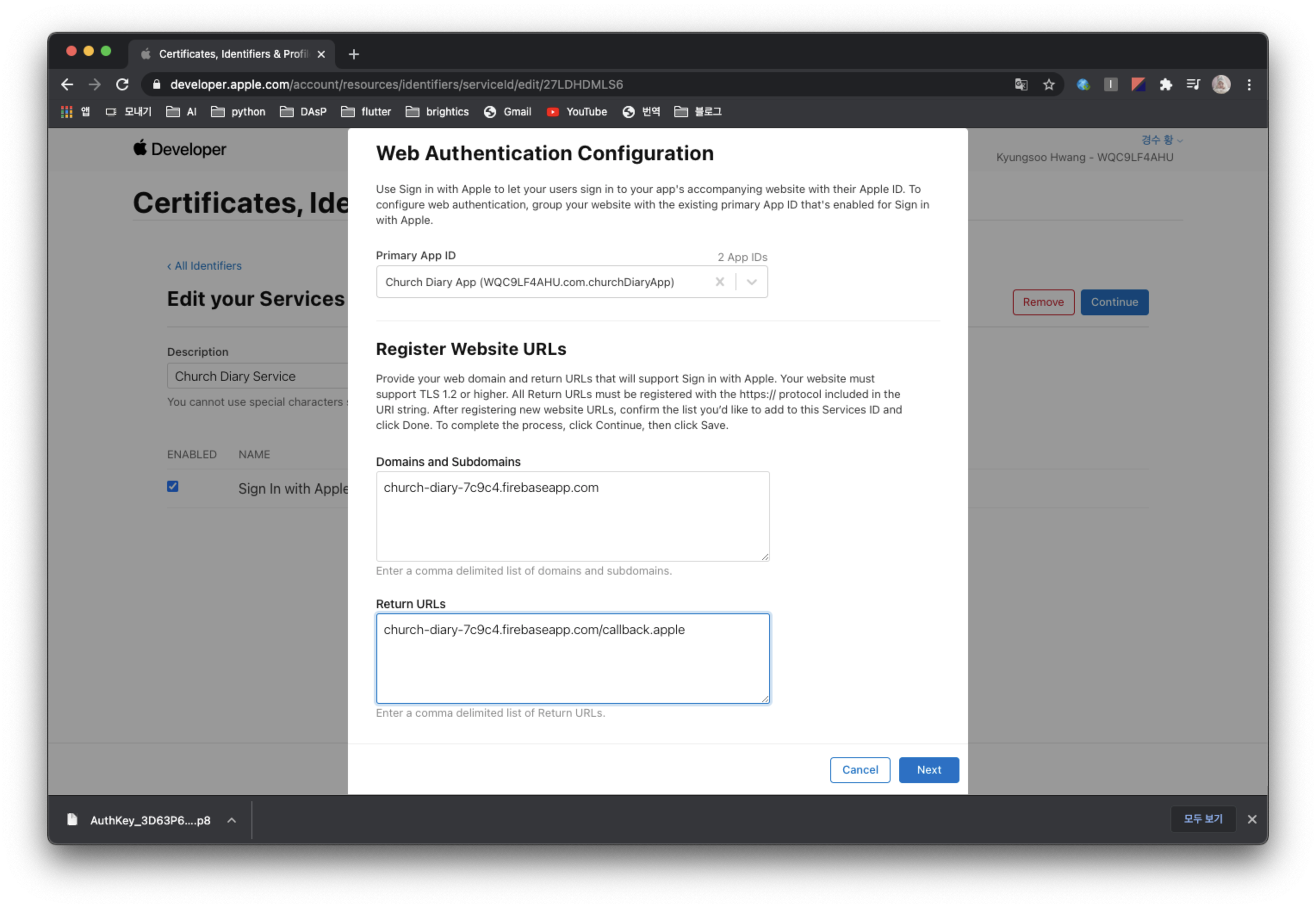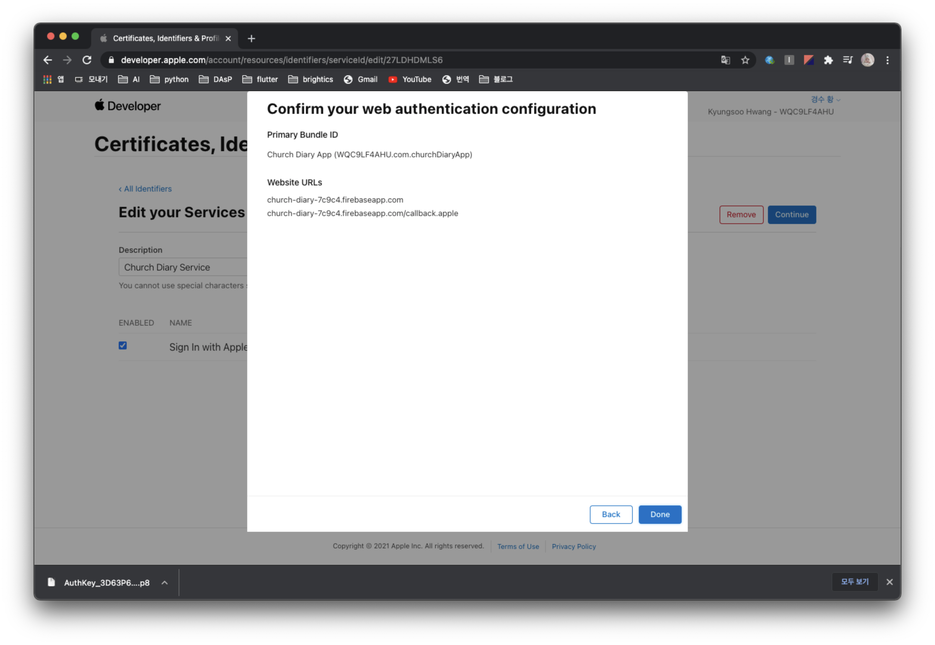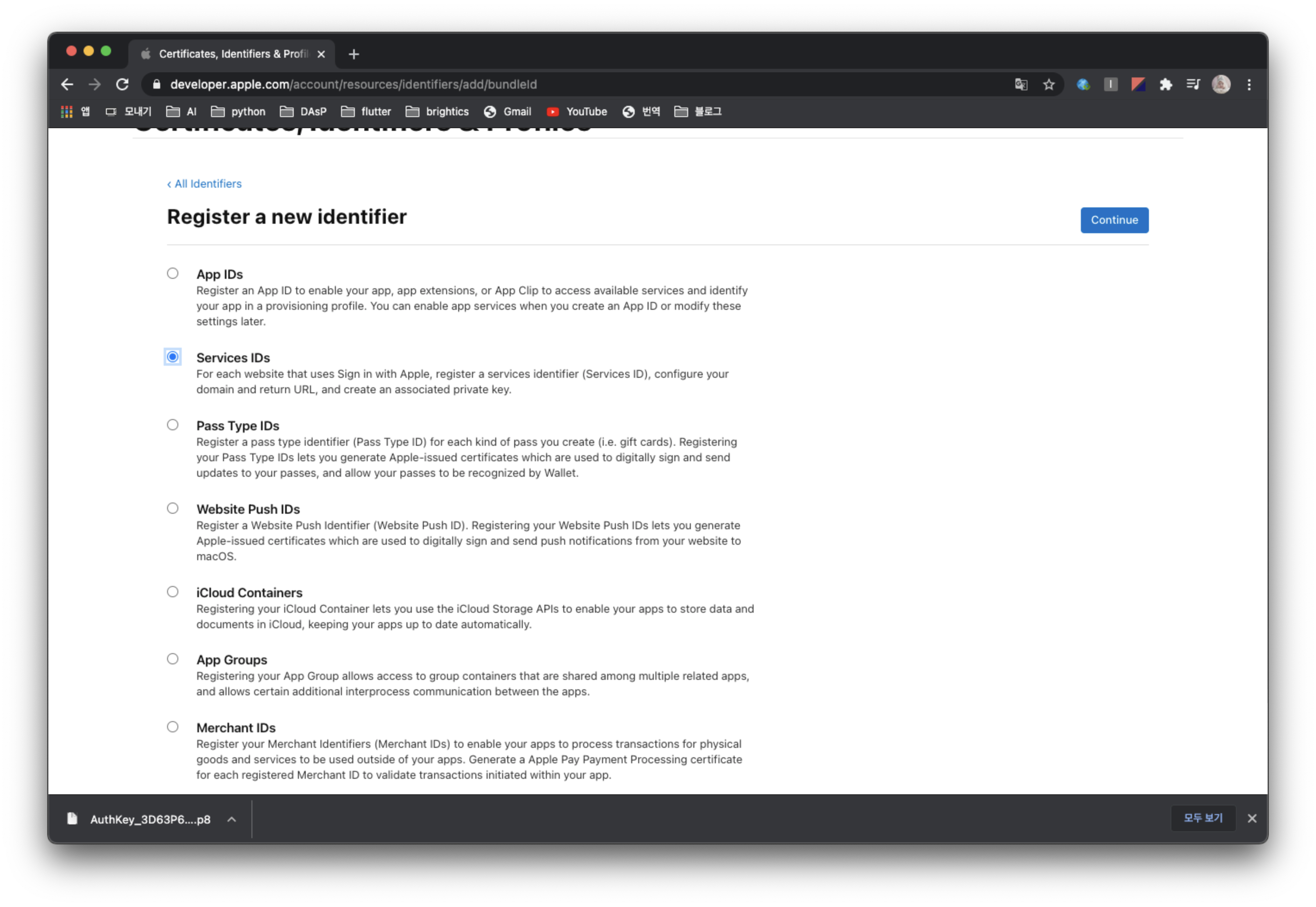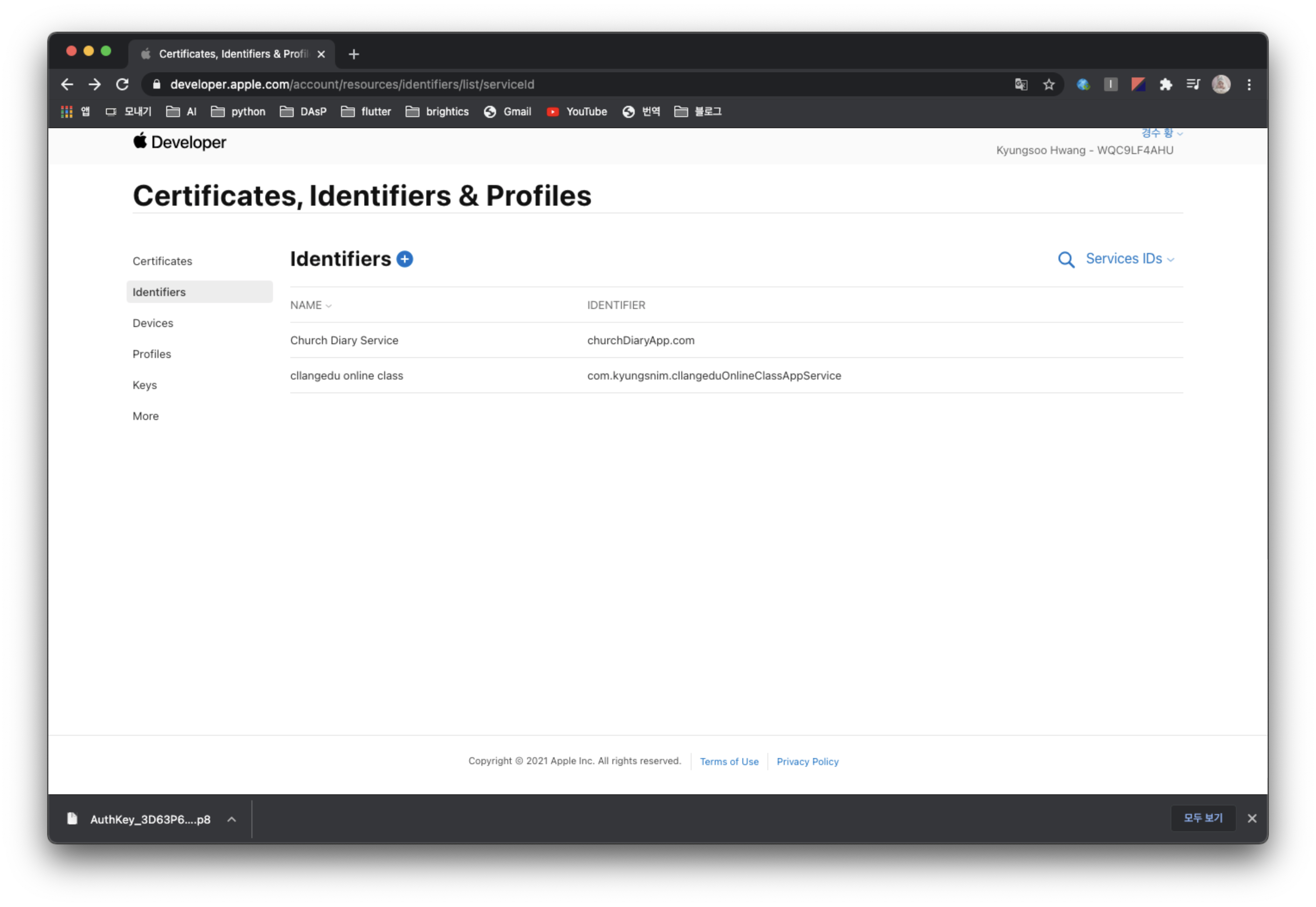 애플 개발자 사이트에 가서 애플 로그인을 수행할 앱을 등록하고, 해당 앱에서 애플 로그인을 사용하도록 Key를 생성하고 Service ID를 생성해줄 것이다.