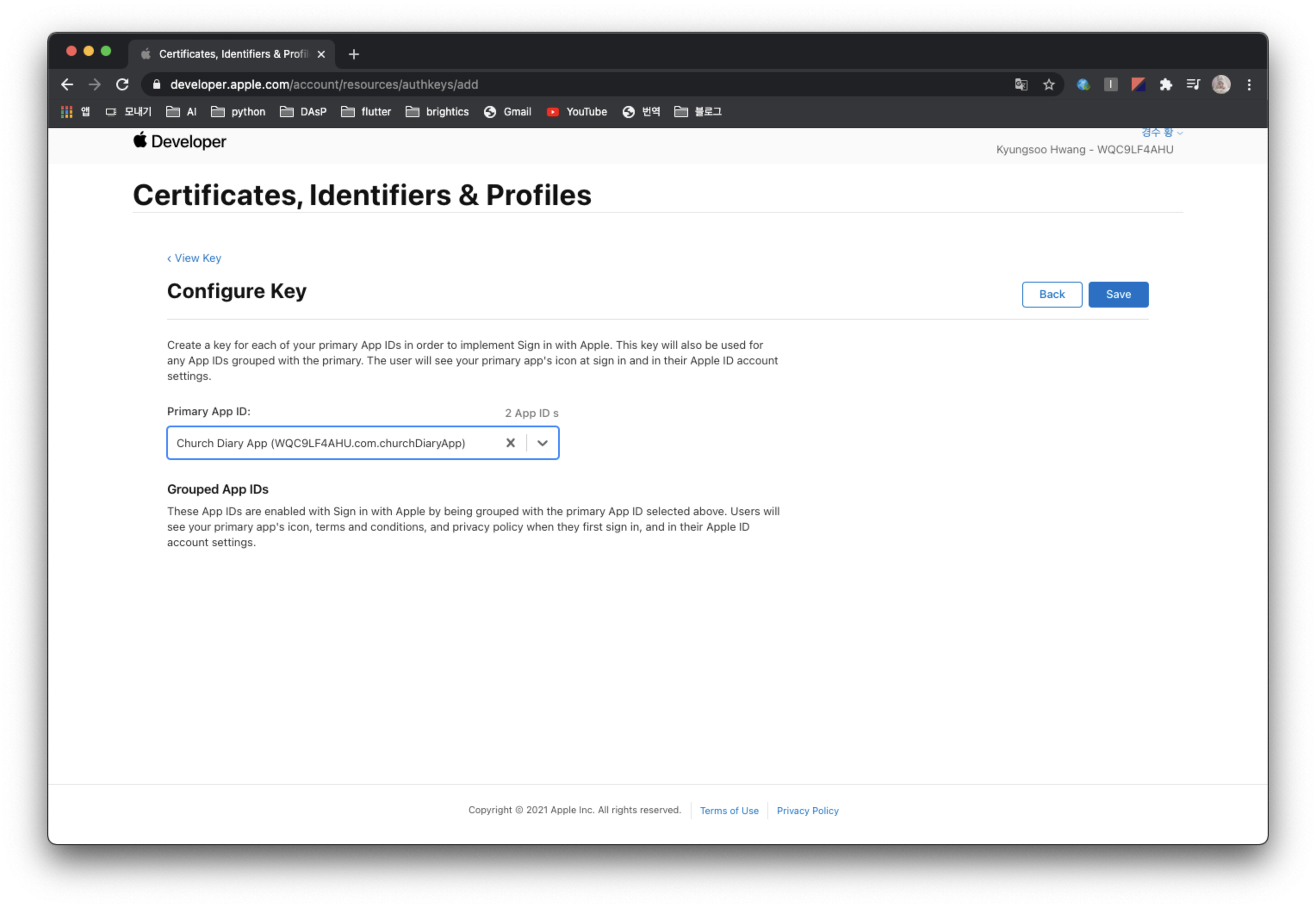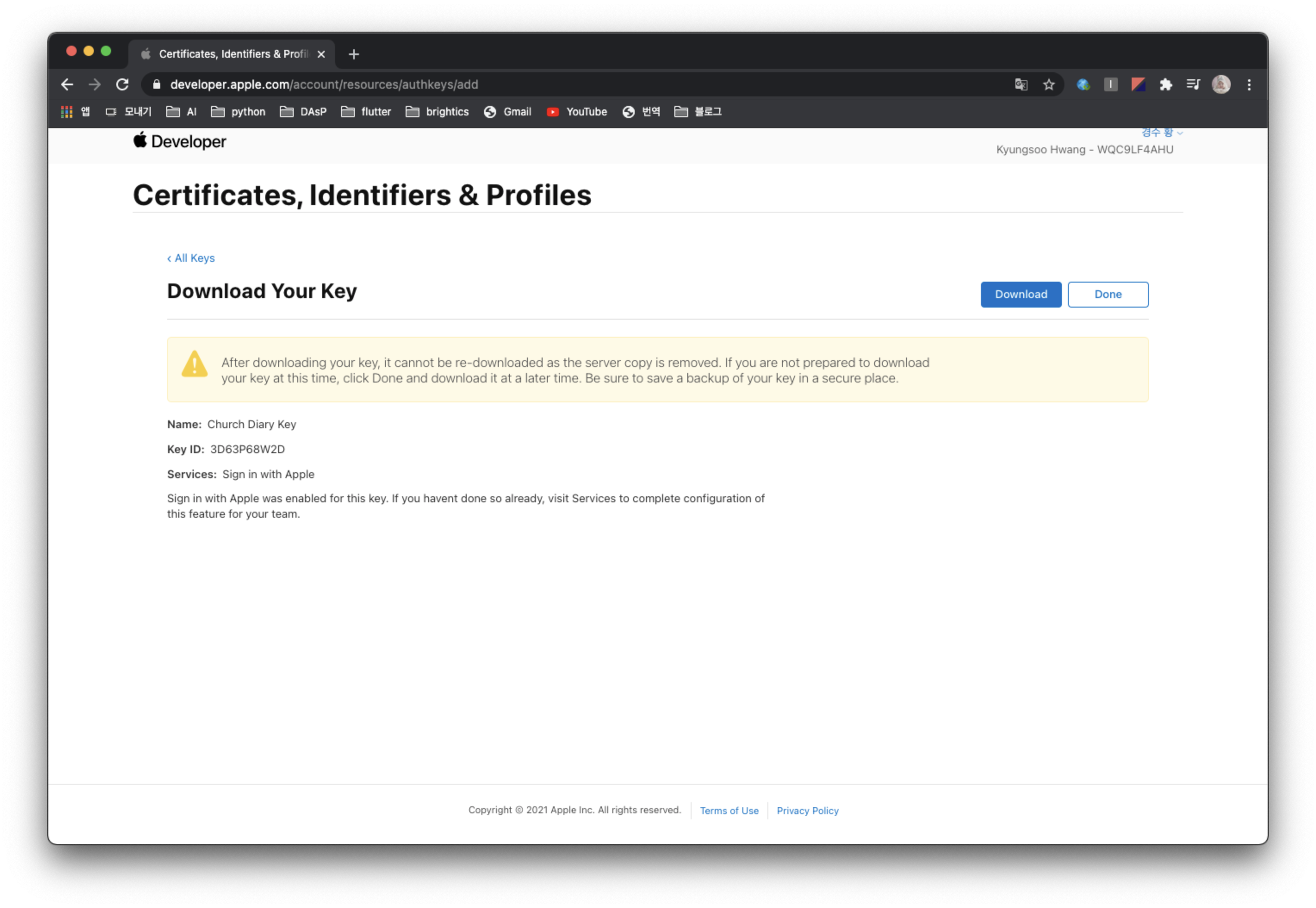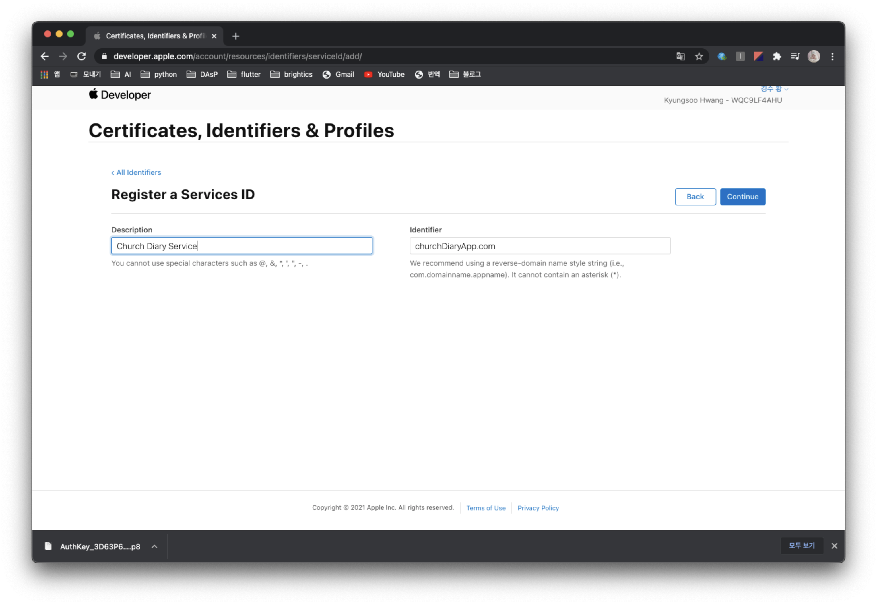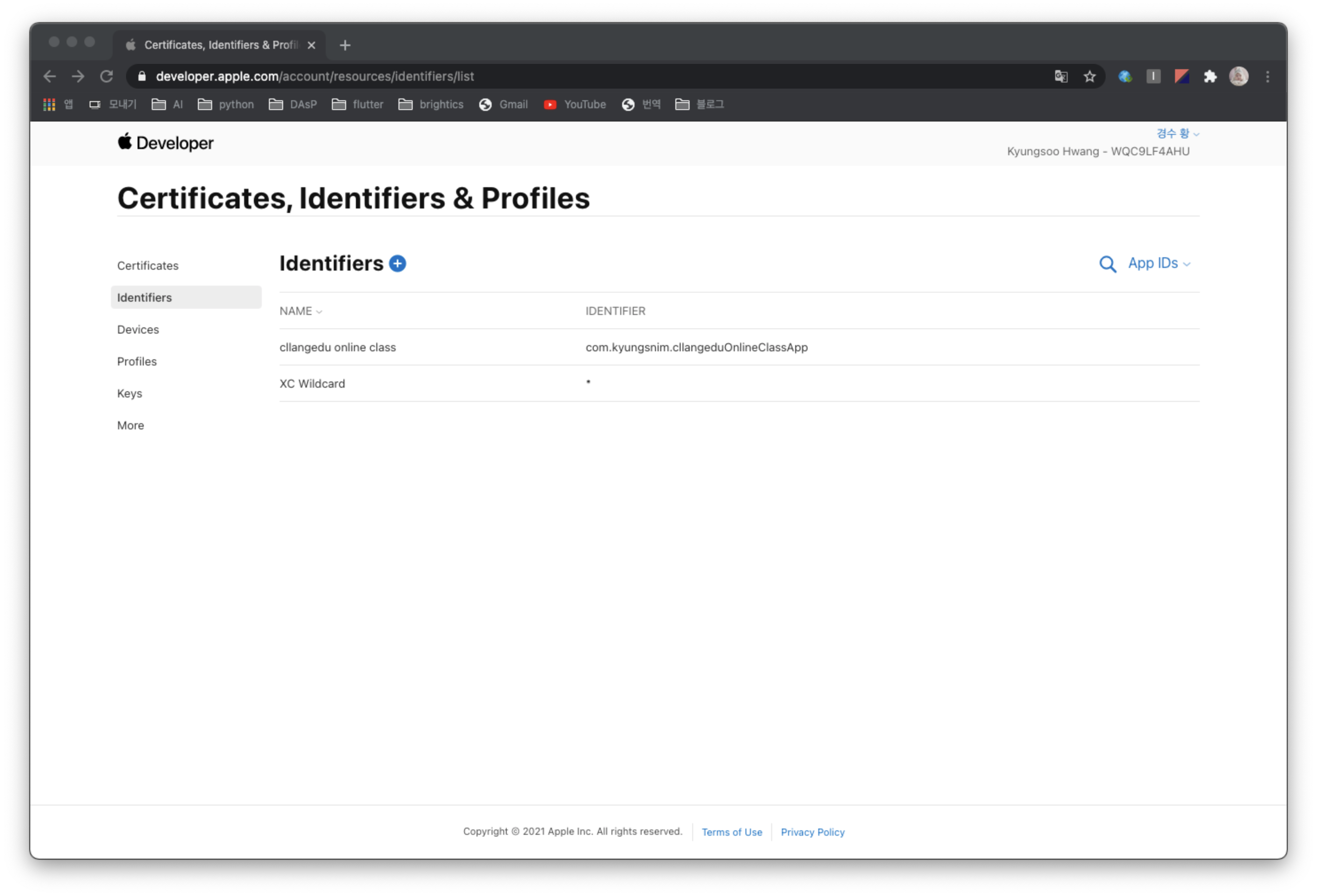 애플 개발자 사이트에 가서 애플 로그인을 수행할 앱을 등록하고, 해당 앱에서 애플 로그인을 사용하도록 Key를 생성하고 Service ID를 생성해줄 것이다.