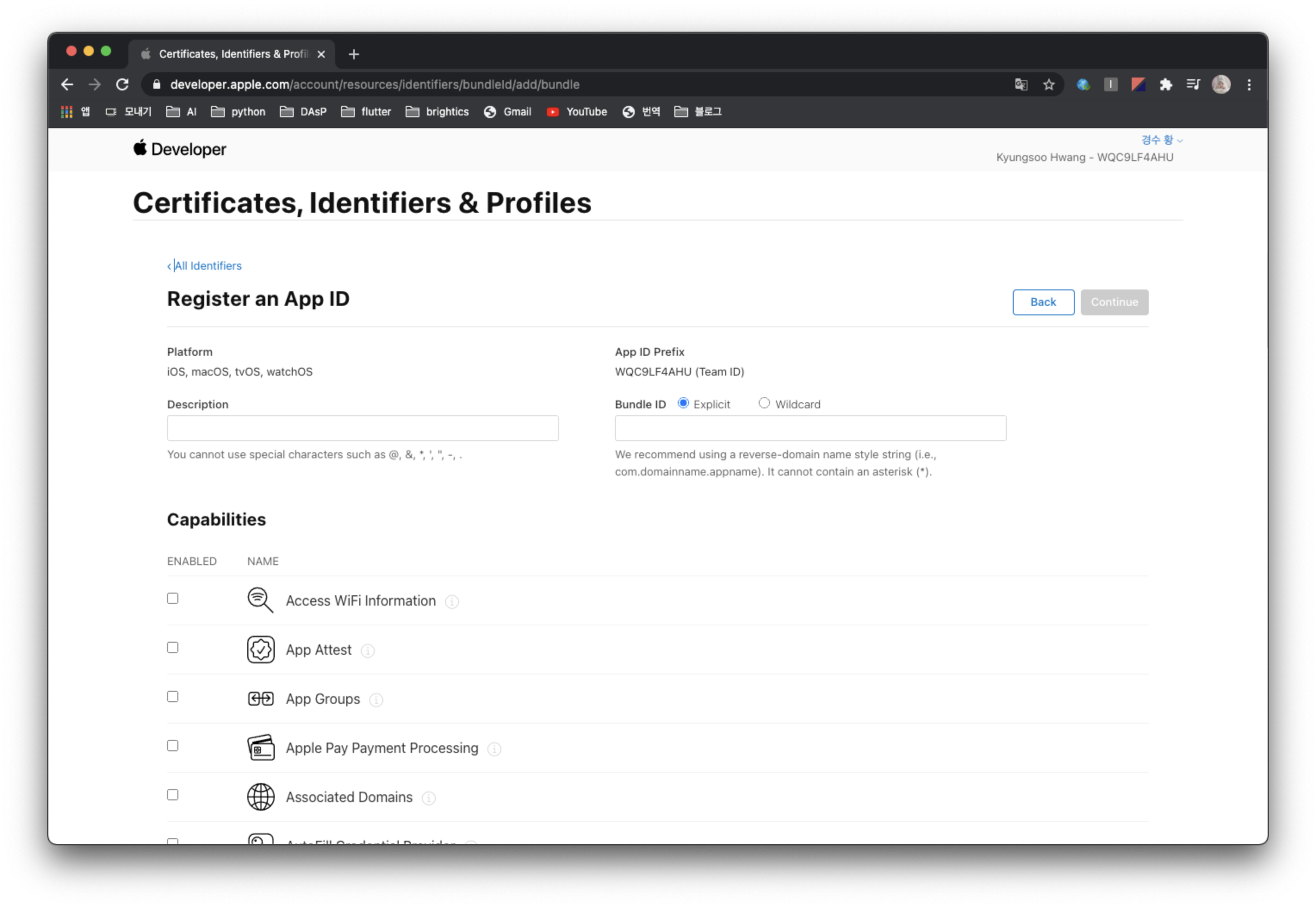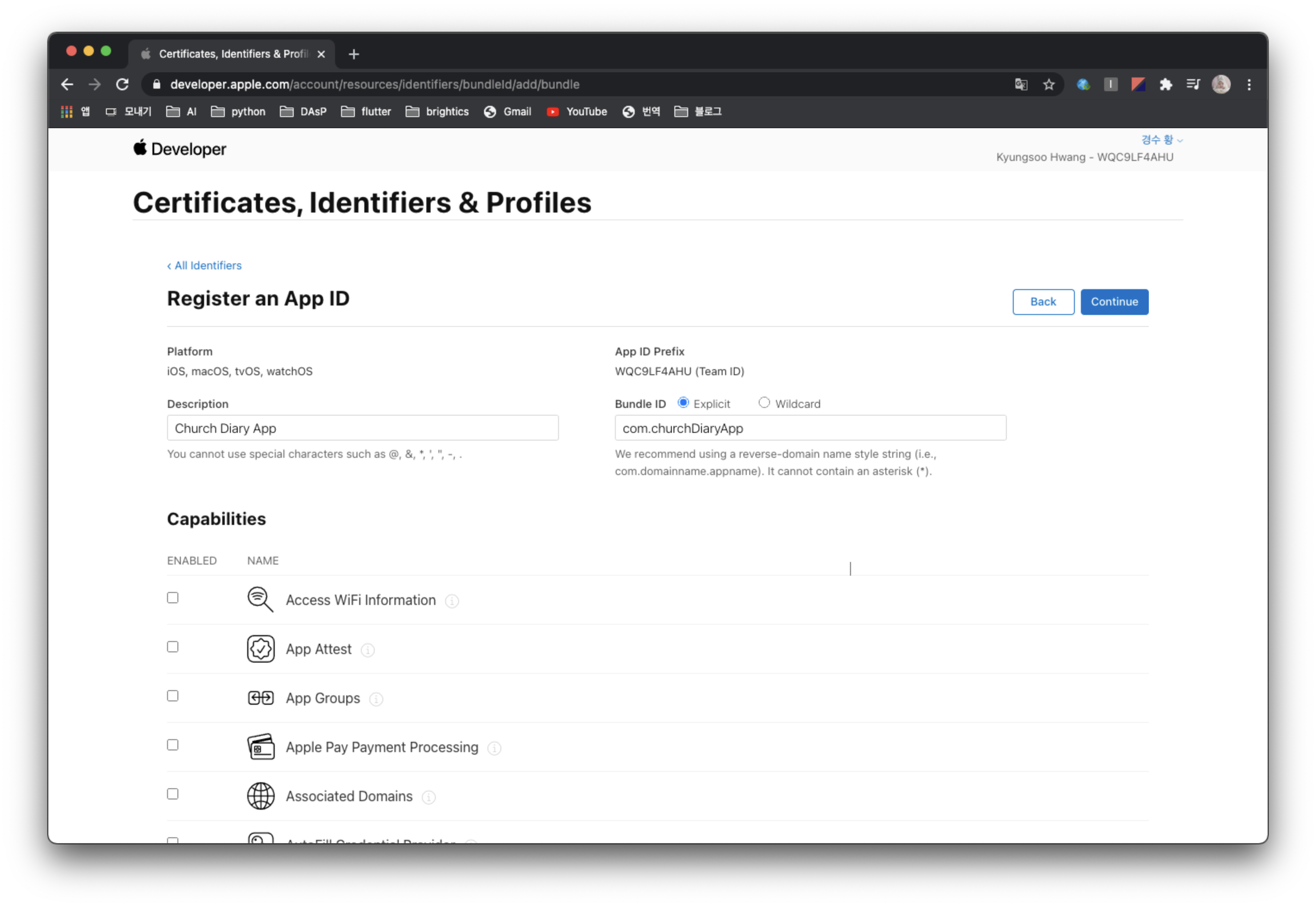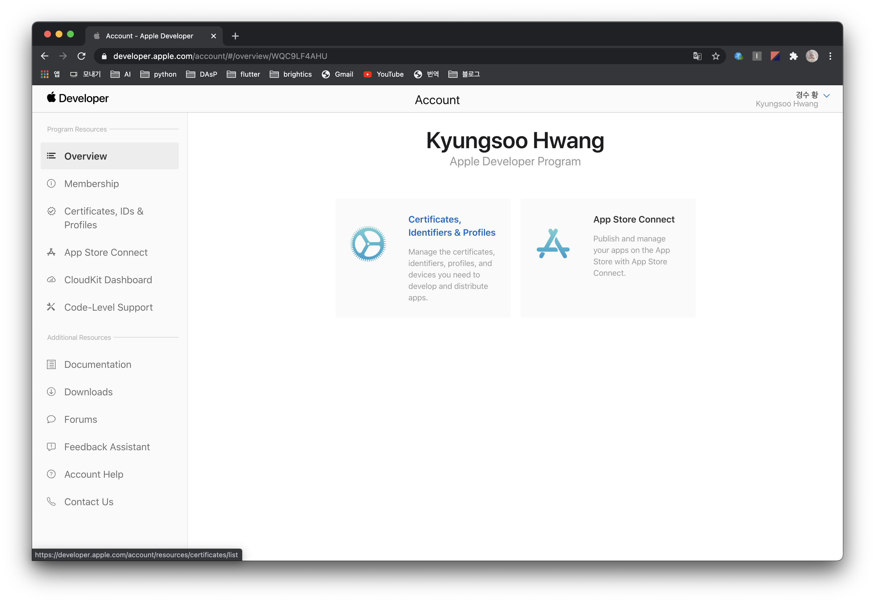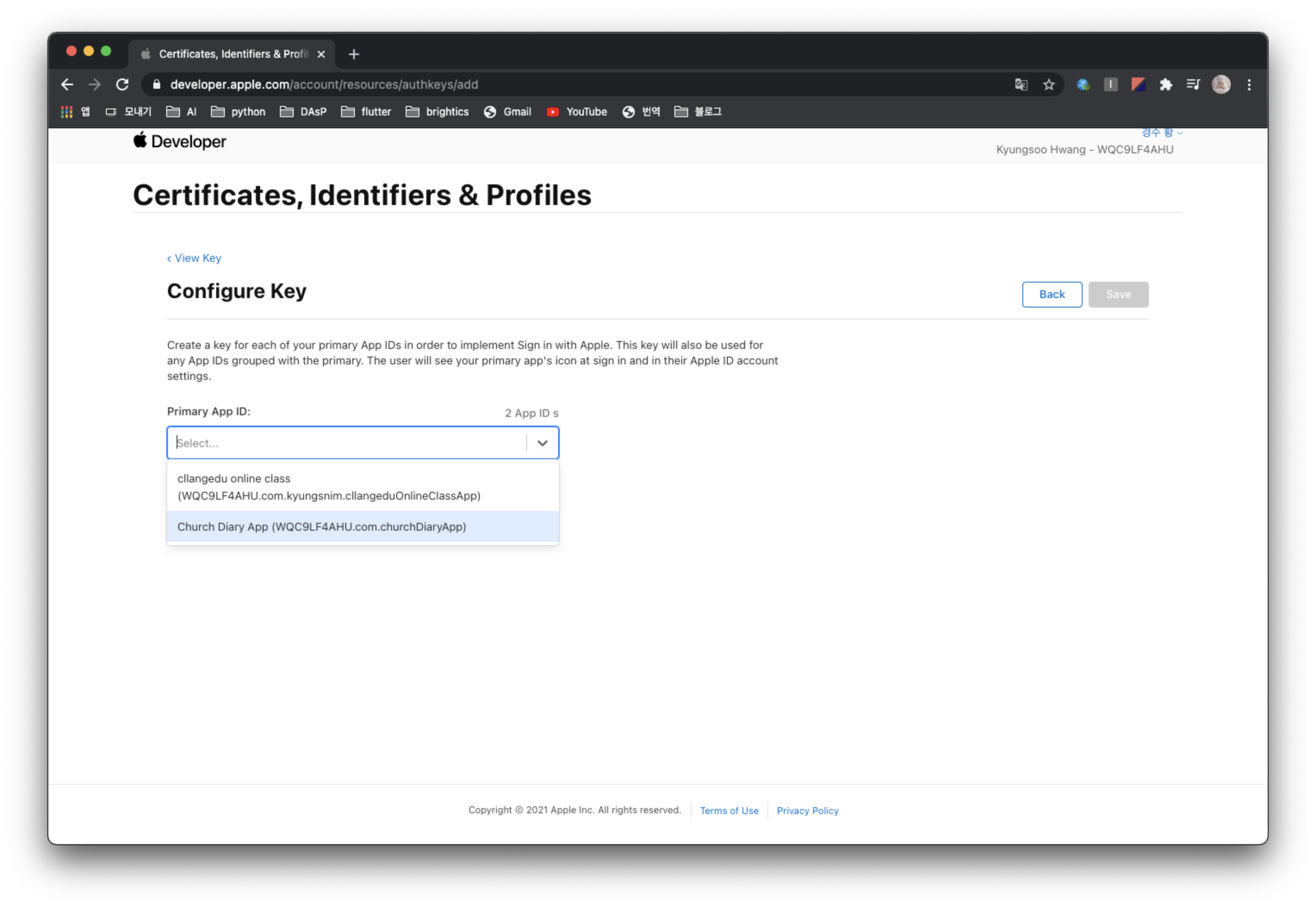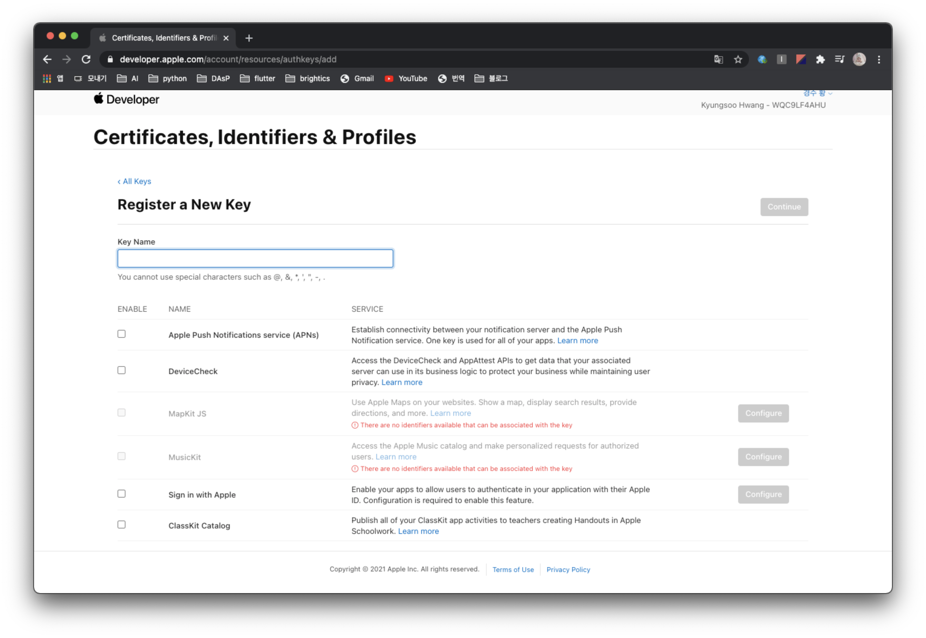 애플 개발자 사이트에 가서 애플 로그인을 수행할 앱을 등록하고, 해당 앱에서 애플 로그인을 사용하도록 Key를 생성하고 Service ID를 생성해줄 것이다.