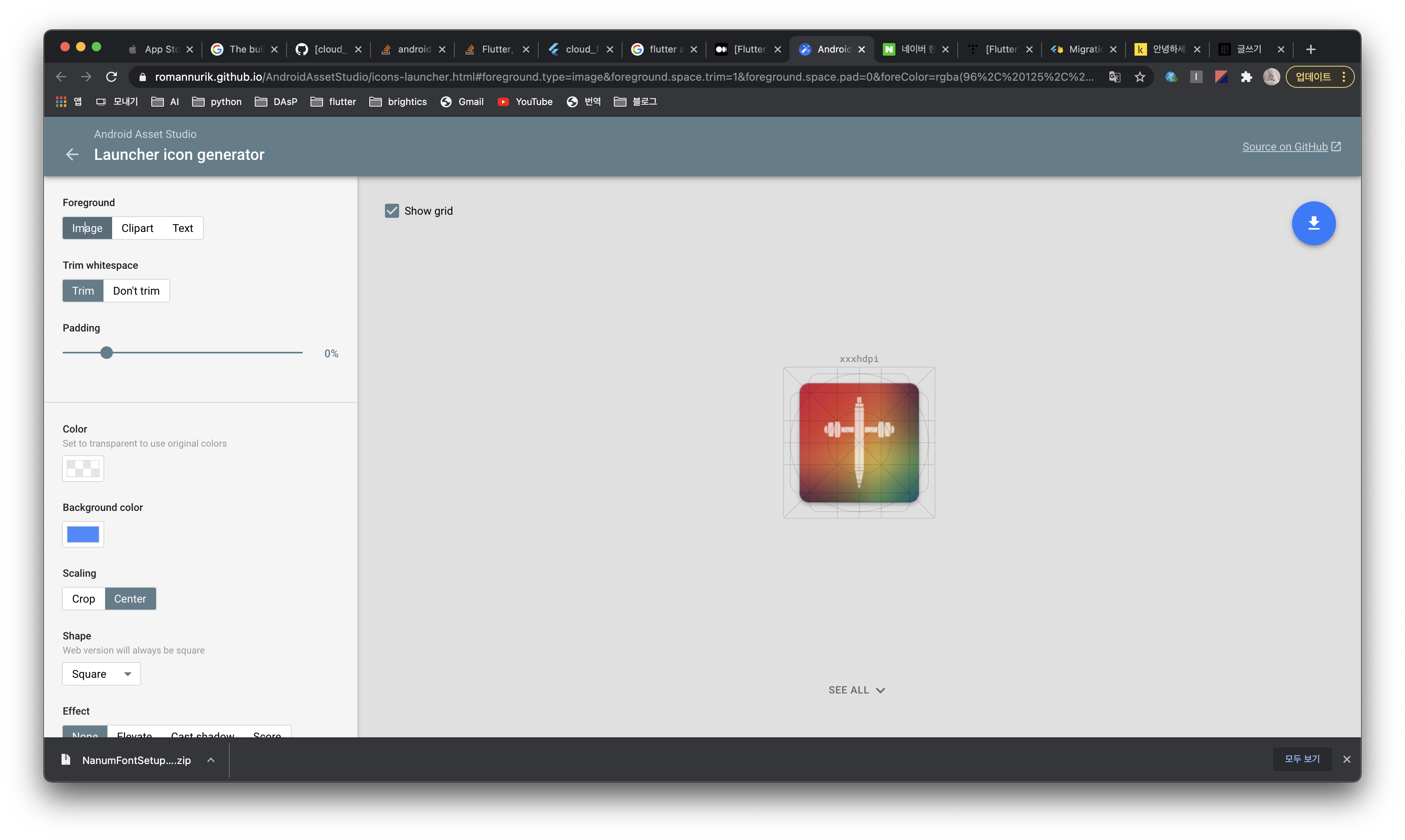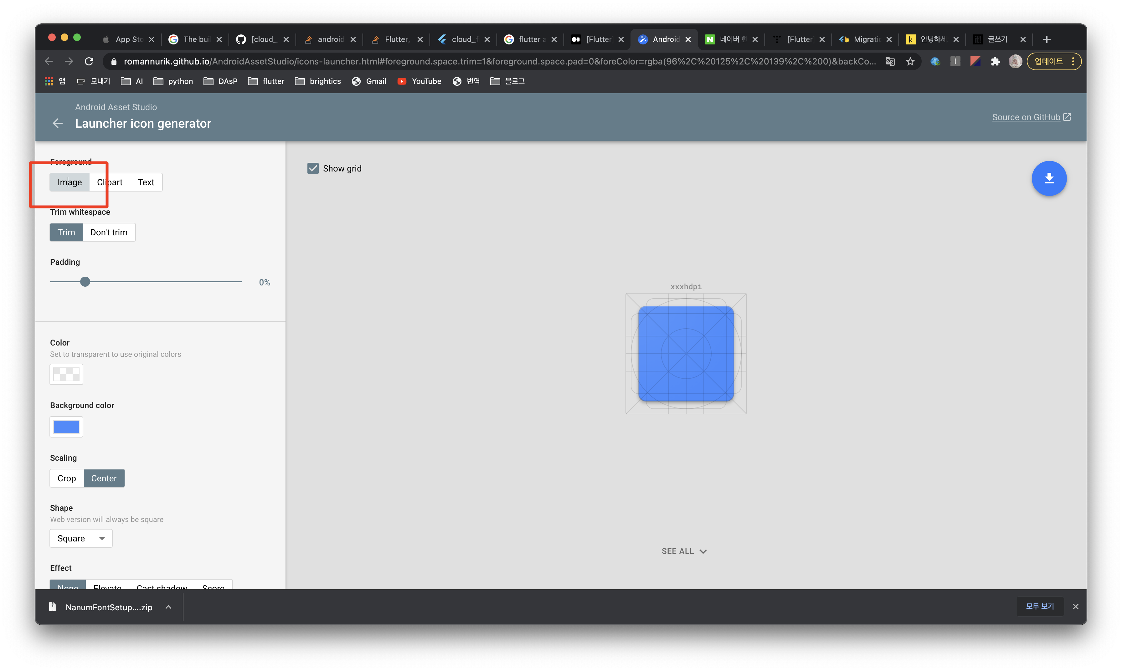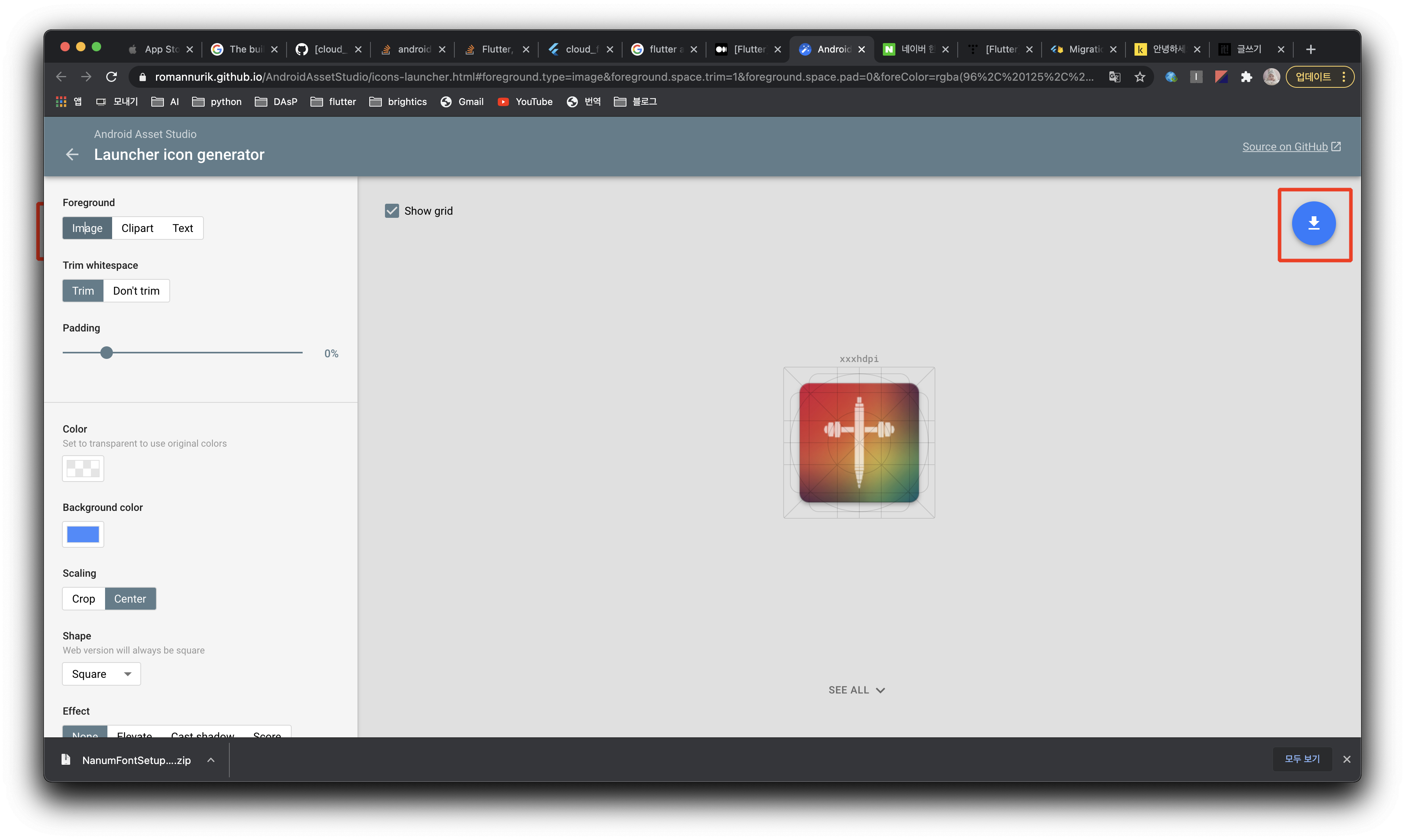 - 다운로드 받으면 ic_launcher.zip 파일로 받아질 것이다. 이 때 압축을 풀고 web_hi_res_512.png 파일을 icon.png 로 변경하자.