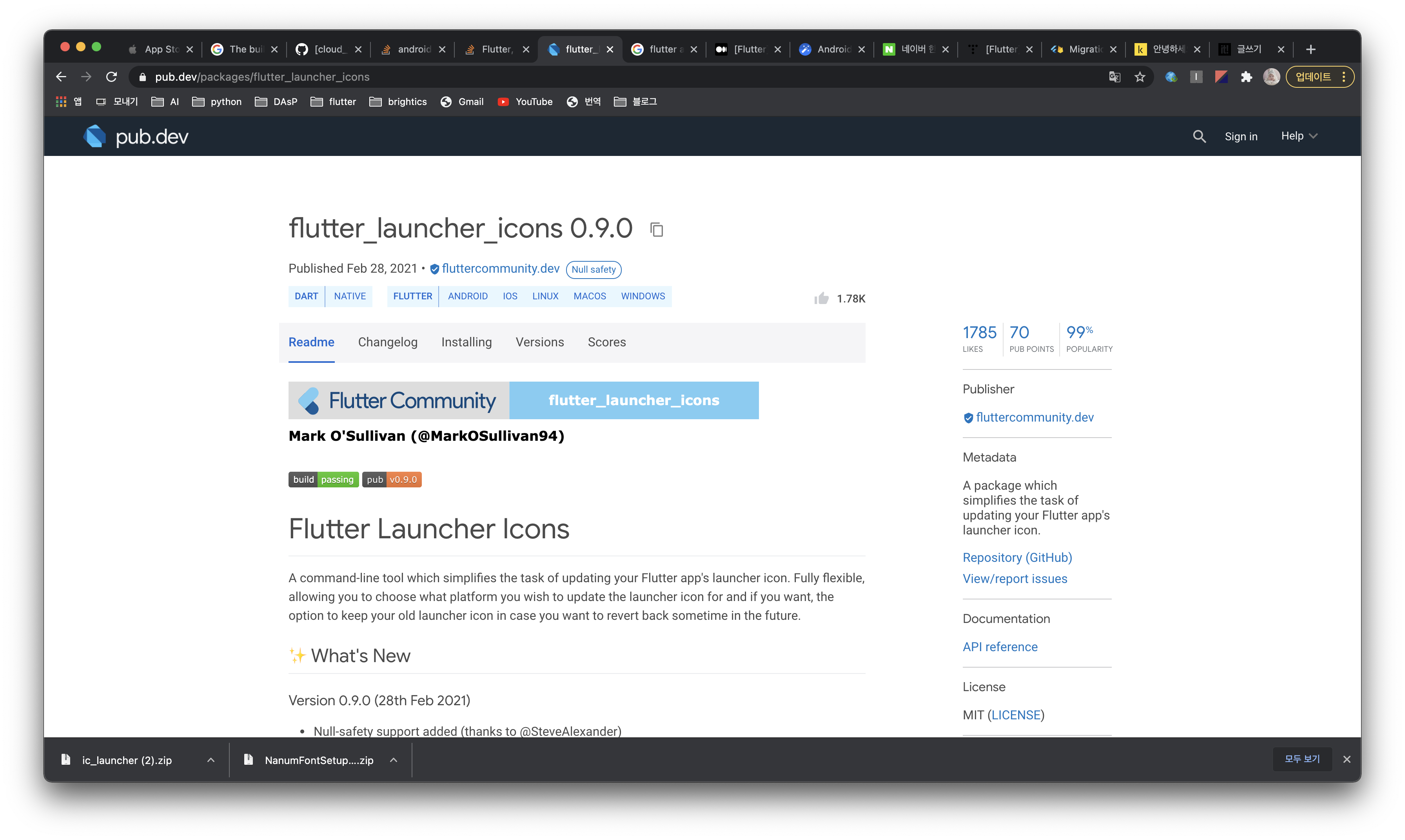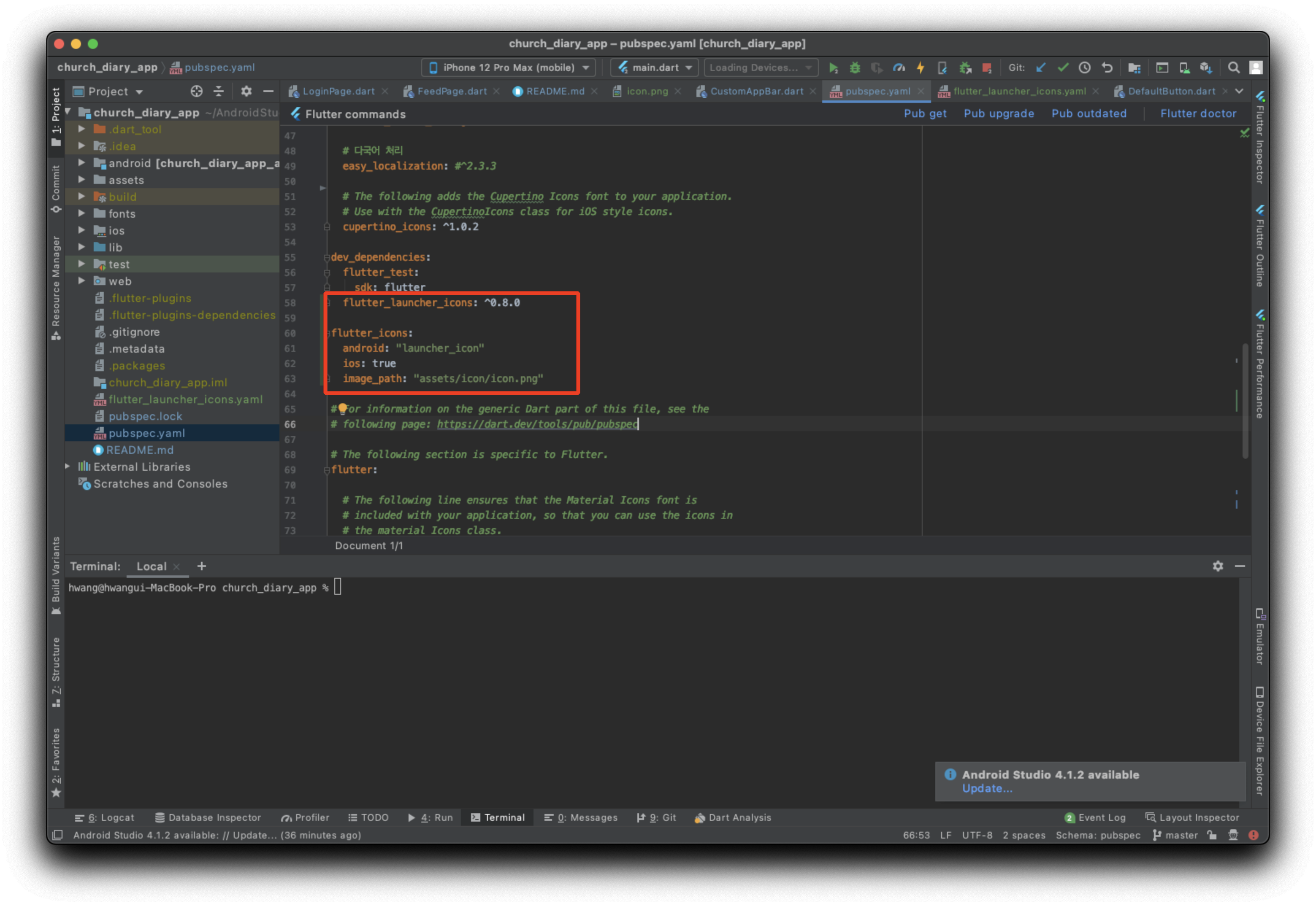 - pubspec.yaml 파일로 이동해 flutter_launcher_icons 패키지를 추가하자 (처음에 0.9.0 버전으로 추가했으나 다른 패키지와 충돌이 나서 0.8.0 버전으로 변경함)