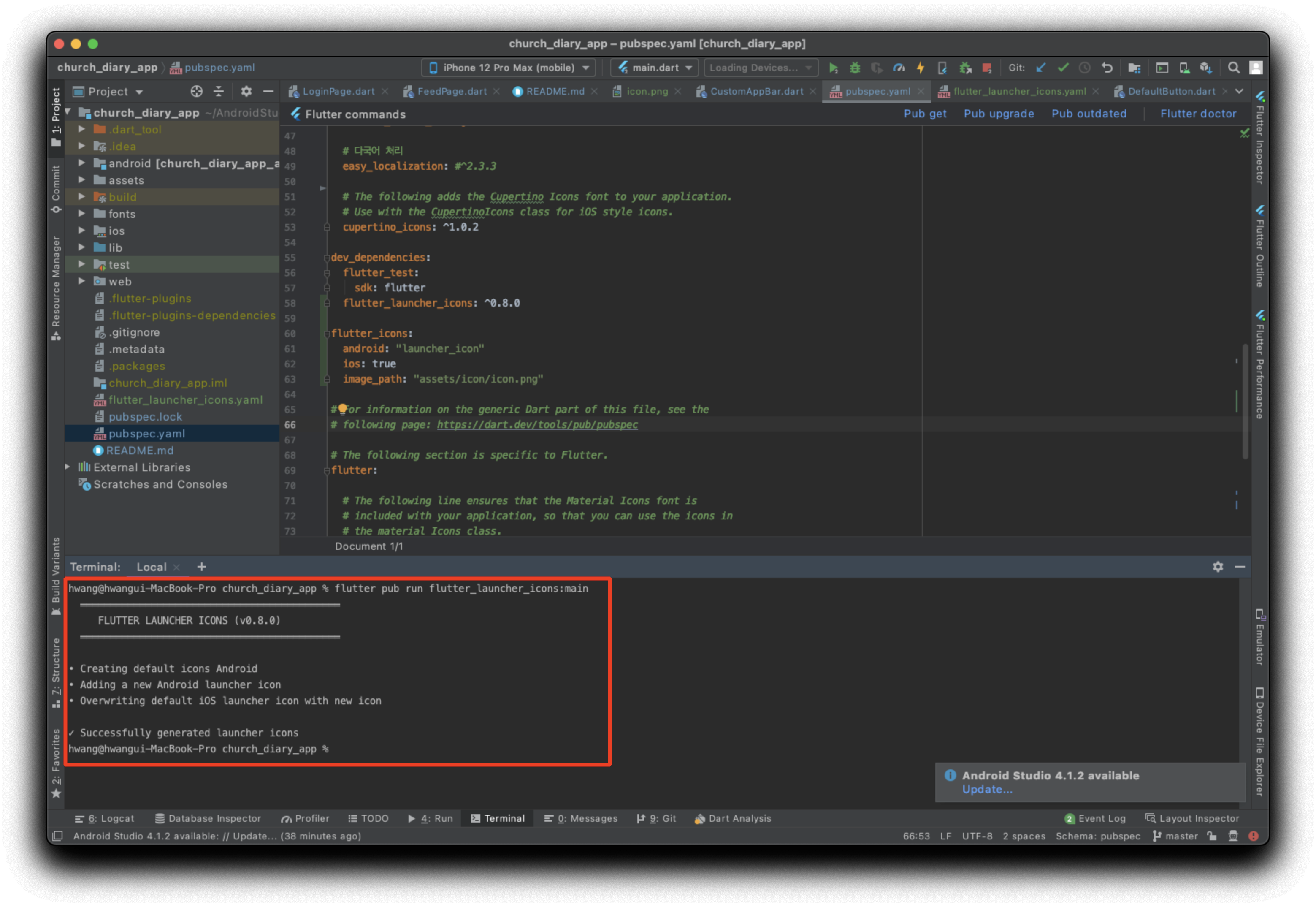 - 터미널 창에서 flutter pub run flutter_launcher_icons:main 명령어를 수행하자.
