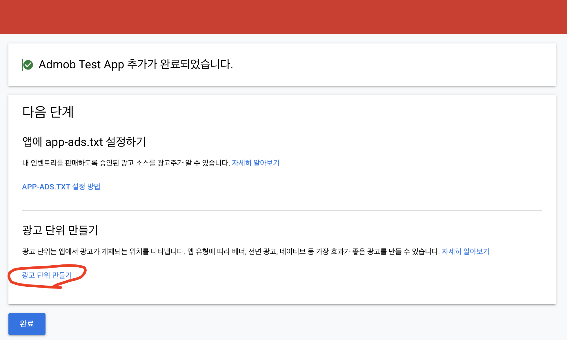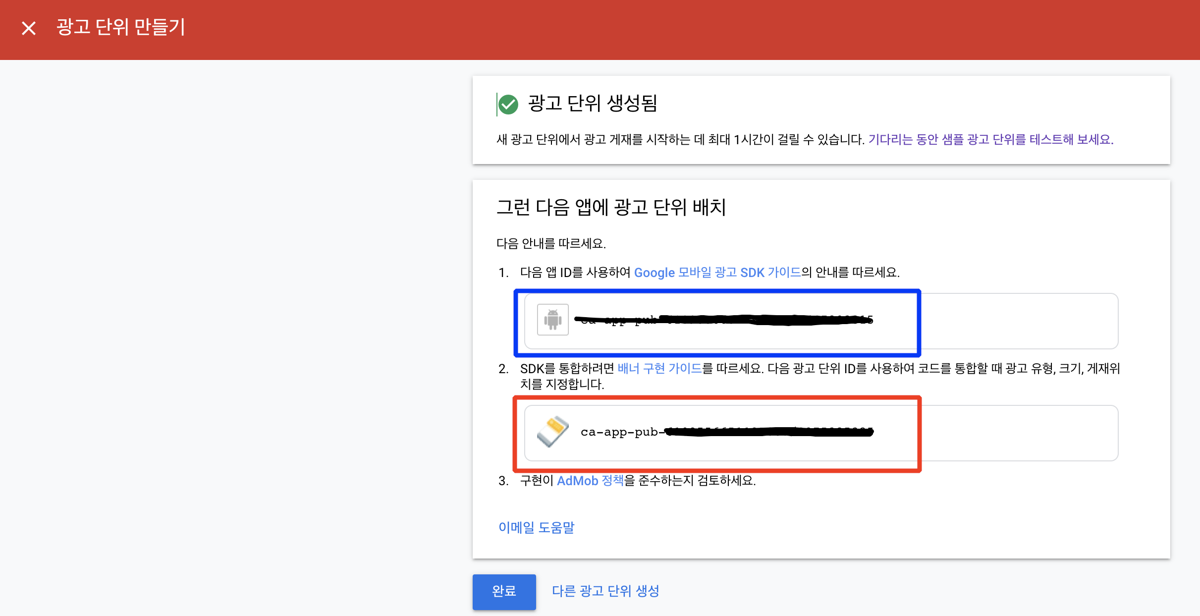 이렇게 애드몹 앱 아이디 생성과 광고단위 생성을 통해 내 앱에 광고를 달 수 있게 되었다.