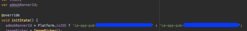 첫 단계로, 아까 위에서 애드몹 광고단위 생성시 얻었던 admob 광고단위 ID로 admobBannerId를 초기화해주자.