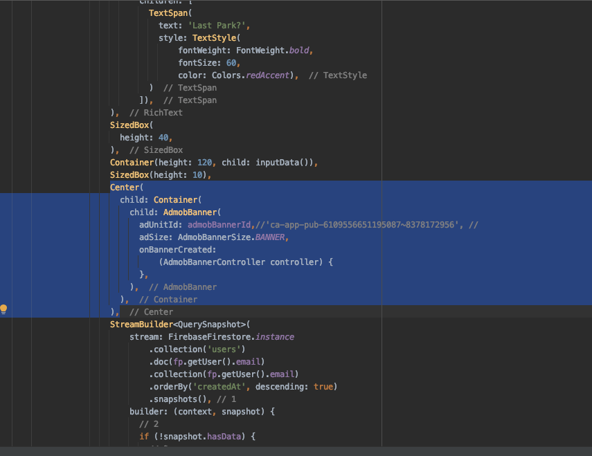 - 이제 실제로 홈 화면에 광고를 달아보자! 이전에는 firebase_admob 으로 구현한 적이 있는데 admob_flutter 와의 가장 큰 차이점은 바로 admob_flutter 는 위젯처럼 다룰 수 있다는 것이다. 아마 firebase_admob 을 사용해본 사람은 알겠지만 배너광고를 달 때 광고 높이만큼 별도의 Container 등으로 공간을 확보해줘야 했다. (그러지 않으면 컨텐츠를 가리는 사유로 출시가 거절될 수 있기 때문) 여튼, admob_flutter 는 그런 설정을 할 필요없이 위젯 넣듯이 바로 넣어주면 된다.