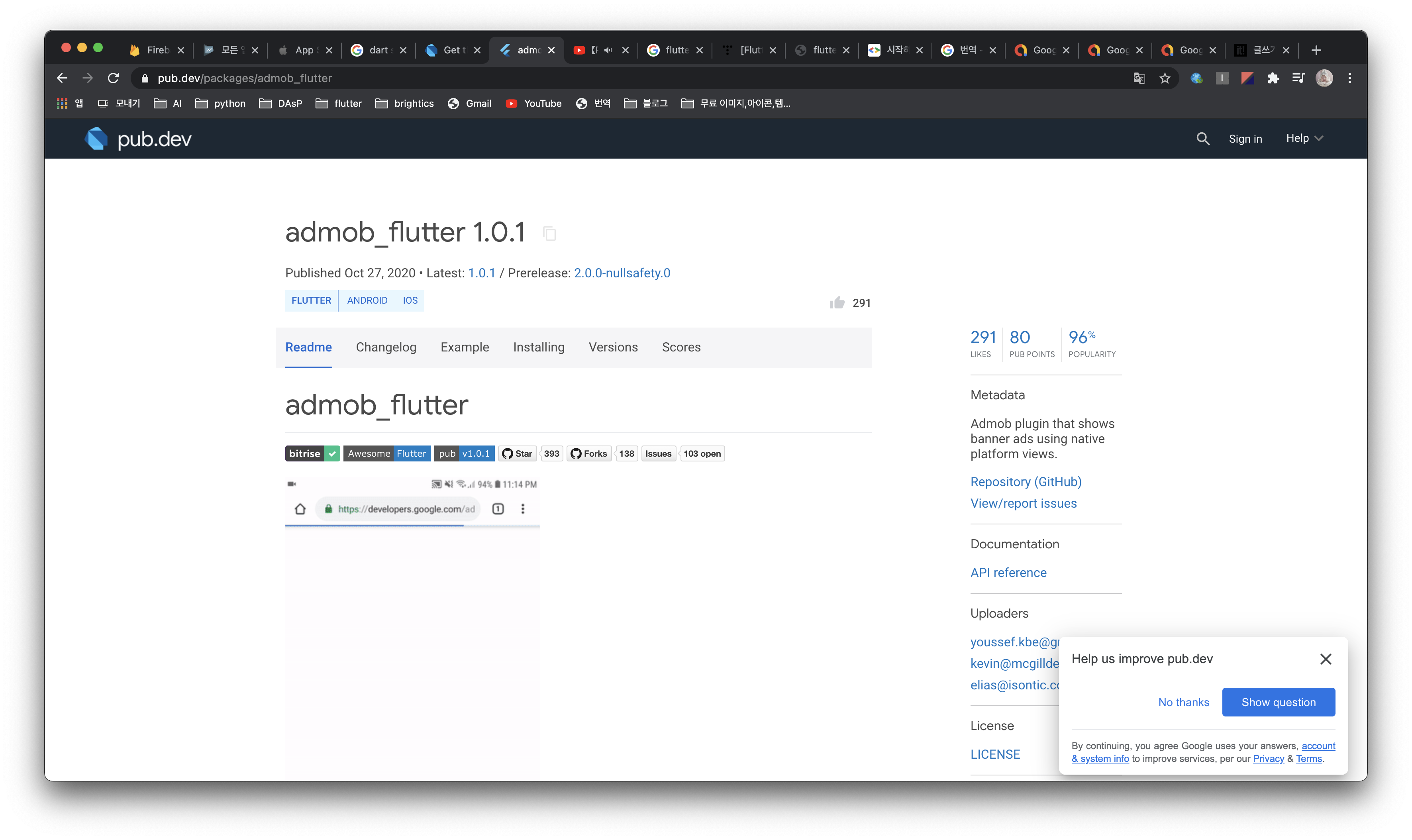- 사용할 패키지를 pub.dev 페이지에 이동해 버전을 확인해주자. 나는 1.0.1 버전으로 추가해주었다.