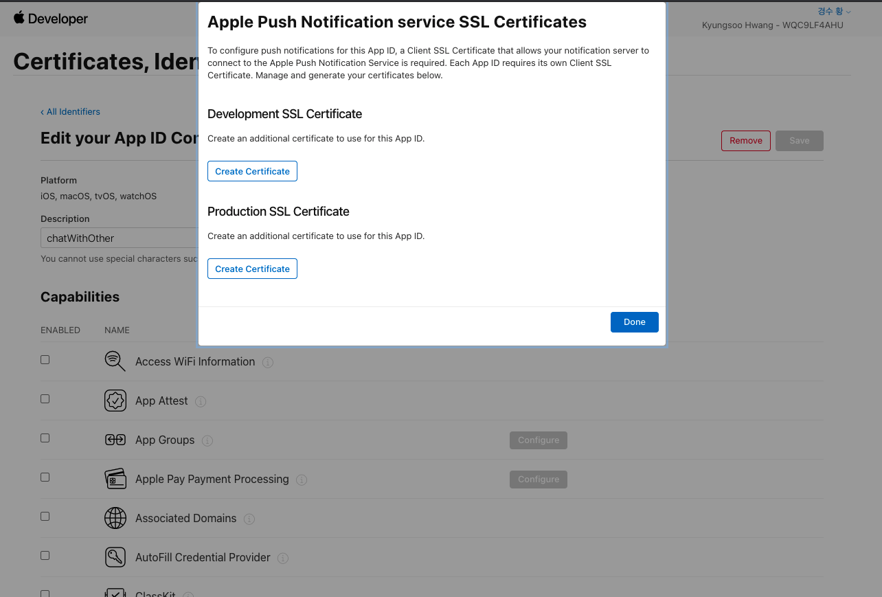 Apple Developer 사이트에서 APNs 등록을 위한 Certificate 및 Key 생성하는 방법에 대해 나온다.