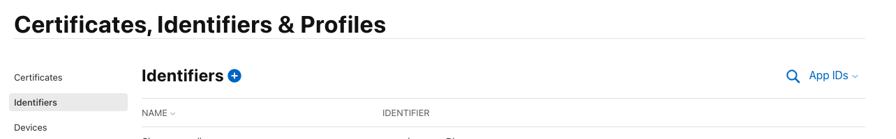 - Apple Developer 사이트 접속 > Certificates, Identifiers & Profiles > App 등록