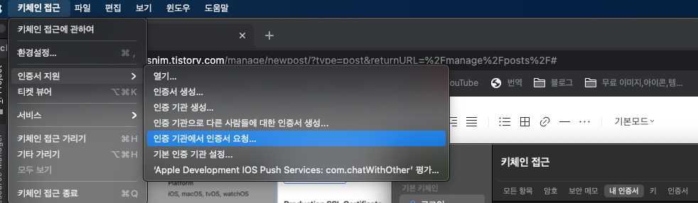 - 키체인 접근 실행 > 인증서 지원 > 인증 기관에서 인증서 요청...