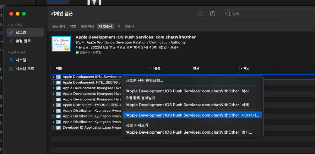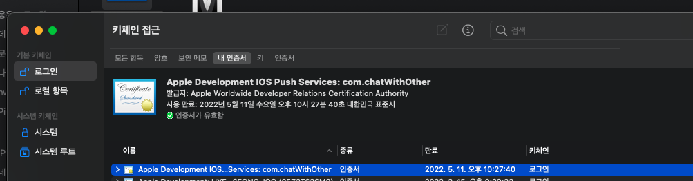- 다운로드 받은 Certificate를 더블클릭 한 후 키체인 접근에 가보면 추가되어 있는 것을 확인할 수 있다.