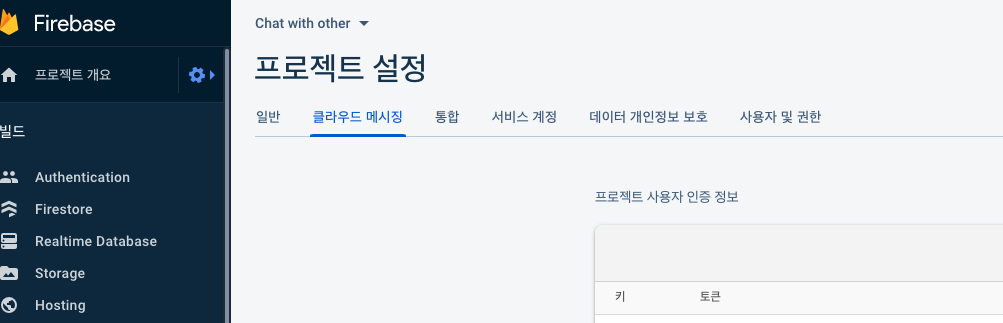 - Firebase 해당 프로젝트 이동 > 프로젝트설정 > 클라우드 메시징 탭