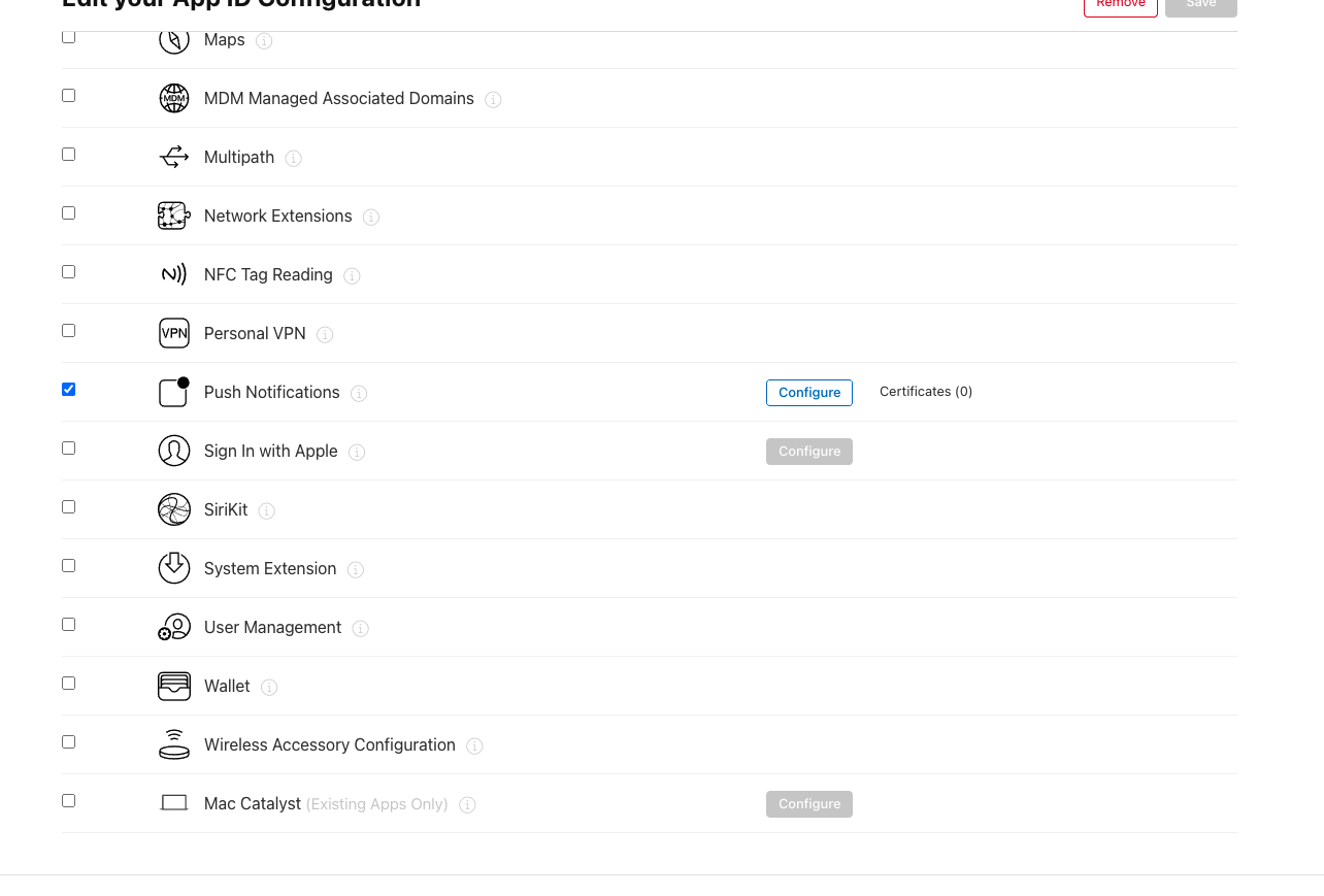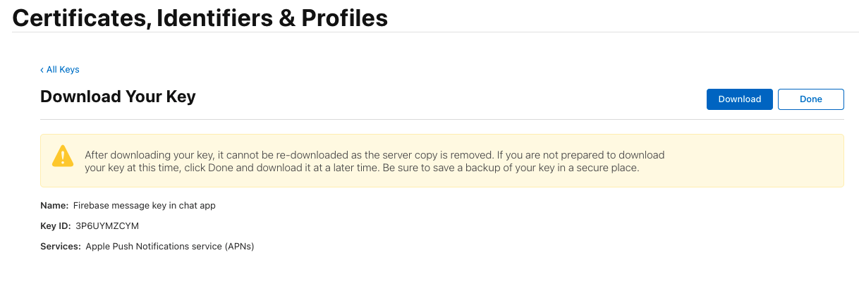 - APN 인증키의 경우 P8파일 필요 > Apple Developer 사이트 > Certificates, Identifiers & Prrofiles