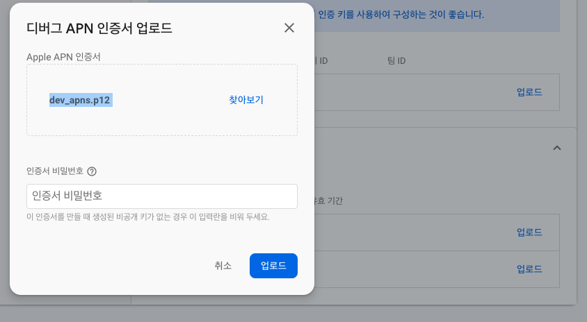 - 우선 APN 인증서 부터 업로드하자. 아까 만든 p12형식의 파일과 인증서 비밀번호 입력 후 업로드 버튼을 클릭