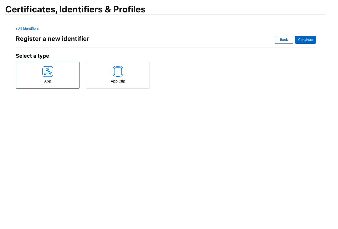 - Apple Developer 사이트 접속 > Certificates, Identifiers & Profiles > App 등록