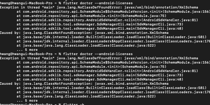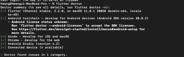 터미널에서 flutter doctor 명령어를 수행했더니 Android toolchain에 문제가 있나보다.