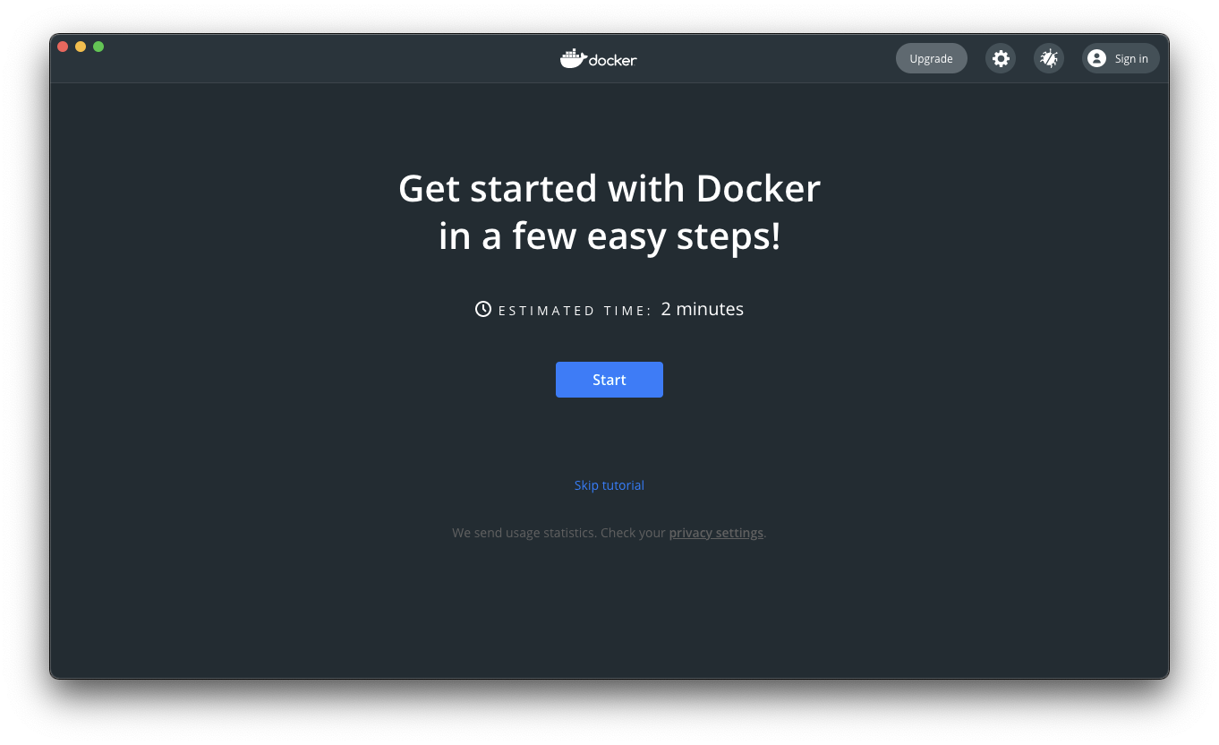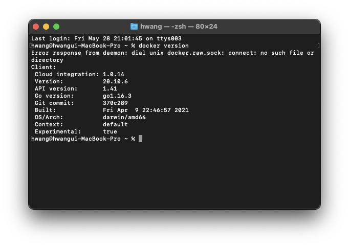 회원가입과는 별개로 조금 전 설치된 docker를 바로 실행을 해보도록 하자. 터미널 열고 아래 명령어를 입력해보자.