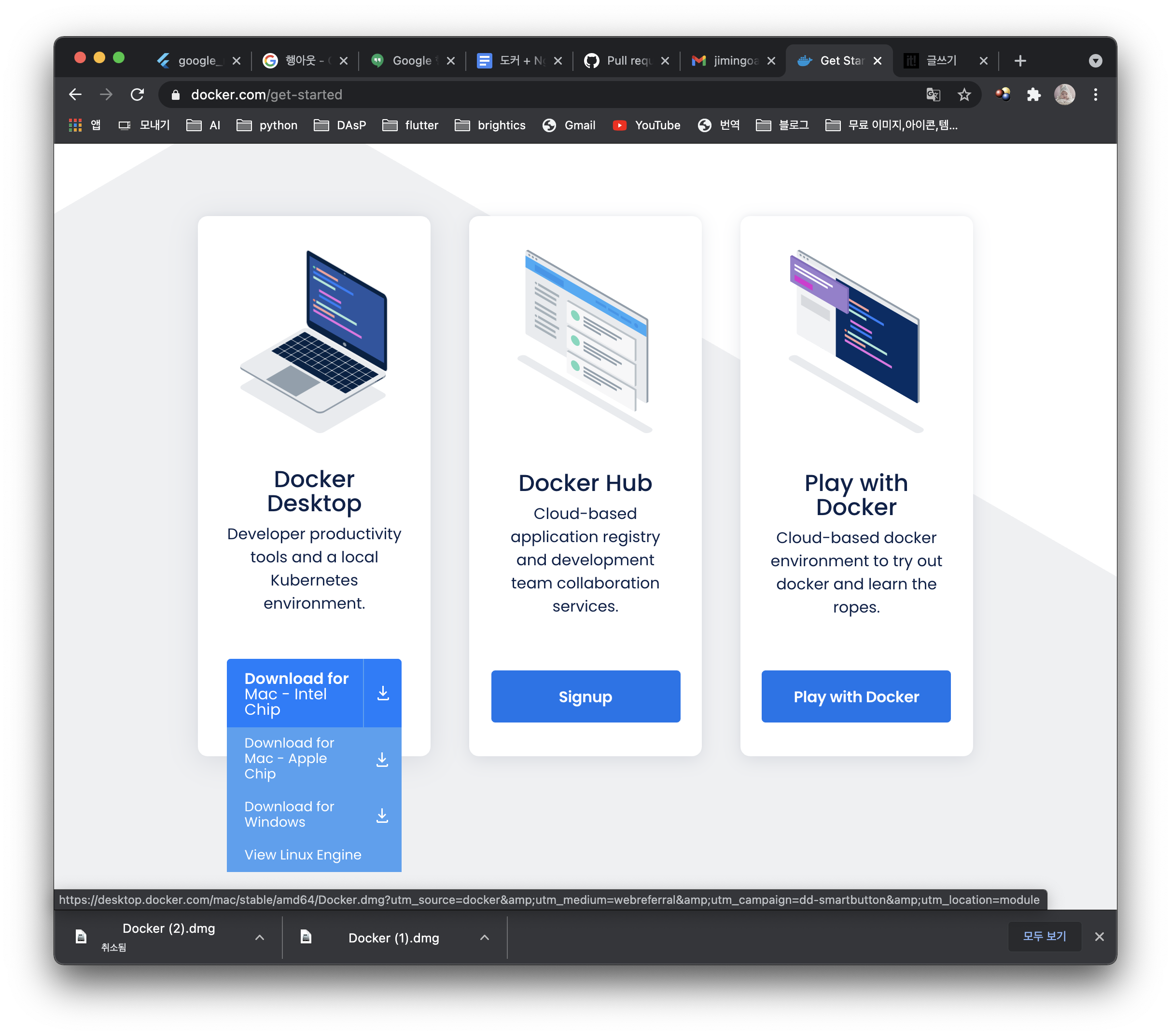 https://hub.docker.com/editions/community/docker-ce-desktop-windows/ 에서 다운받자. 주의할 점이 있는데 Mac 사용자의 경우 Download for Mac - Intel Chip / Apple Chip 이 구분되어 있으니 본인에게 맞는 사양으로 다운받도록 하자.