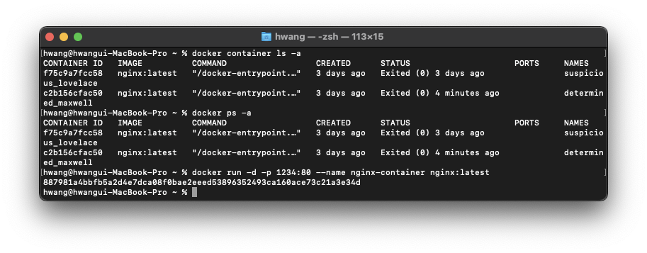 - --name 옵션을 주는 경우 그 뒤에 붙은 nginx-container 컨테이너 이름으로 생성하는 옵션