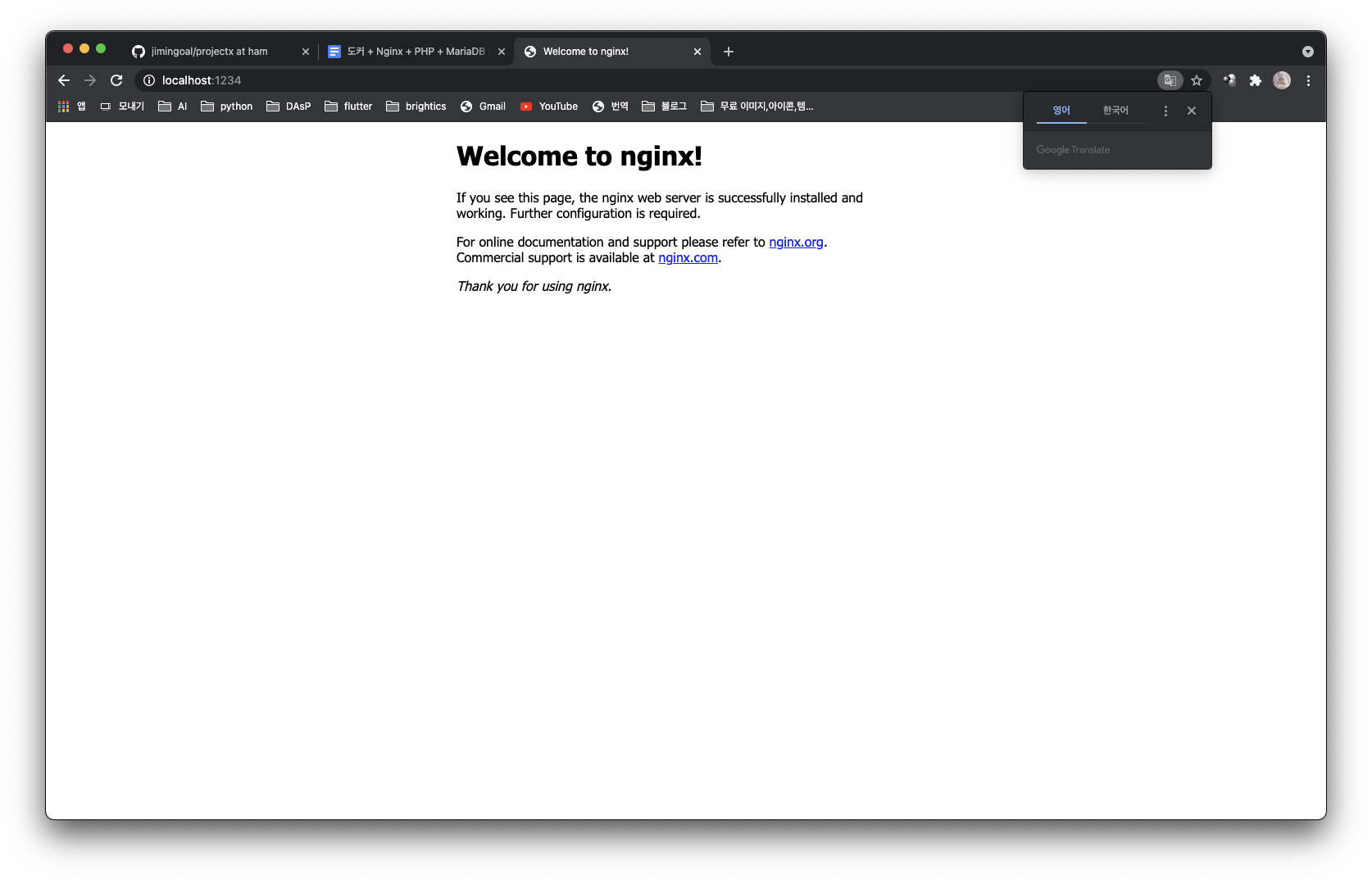 - -d 옵션을 주는 경우 Nginx 웹서버가 백그라운드로 실행되며 명령 실행이 종료되어도 웹서버가 계속 실행 중이다.