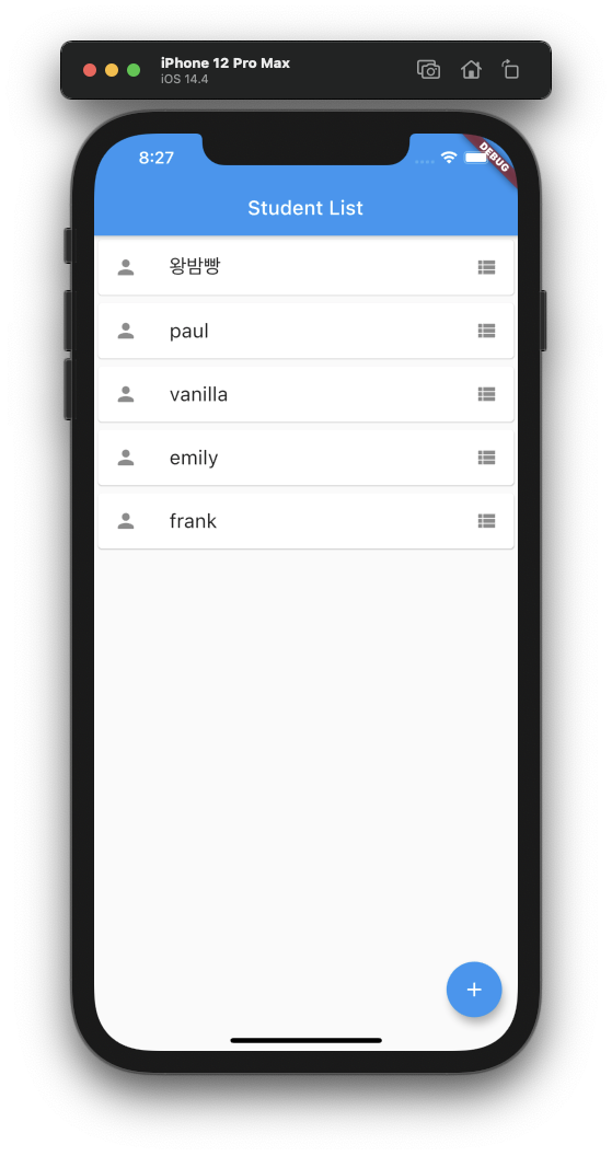 - 최초 앱 실행 : Home화면 => list.php 학생 목록 가져오기 (나는 db에 일부 값들을 미리 넣어놓았다.)