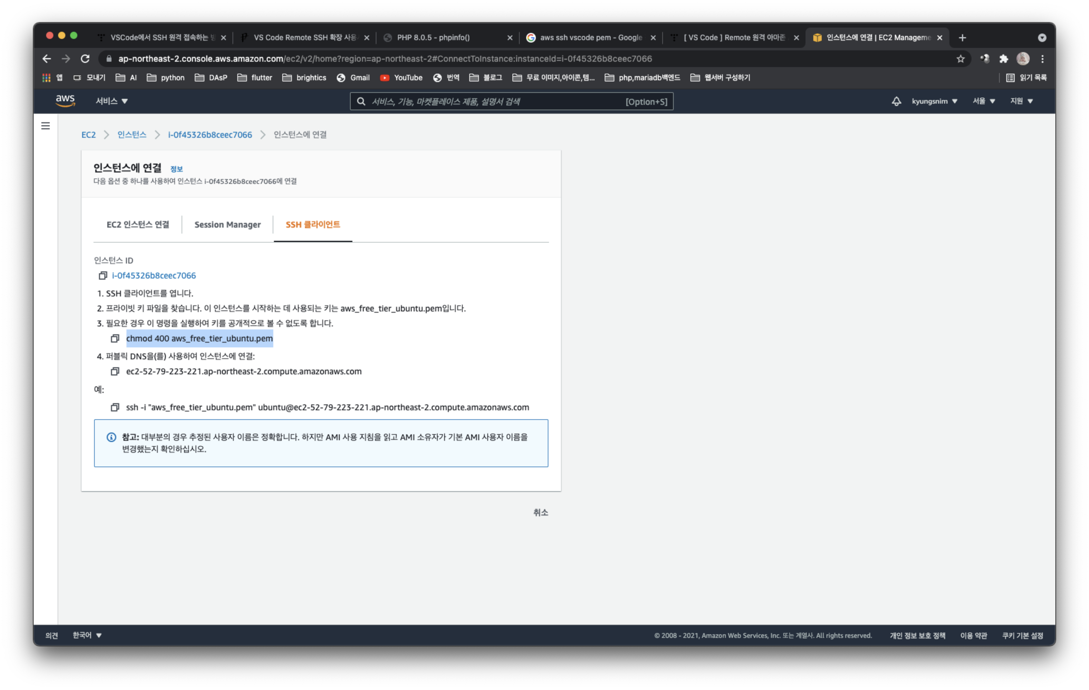 - aws cloud의 key.pem 파일이 있는 폴더로 이동하여 key.pem 파일에 읽기 권한 넣어주기 (AWS 인스턴스 연결 가이드를 참고했다.)