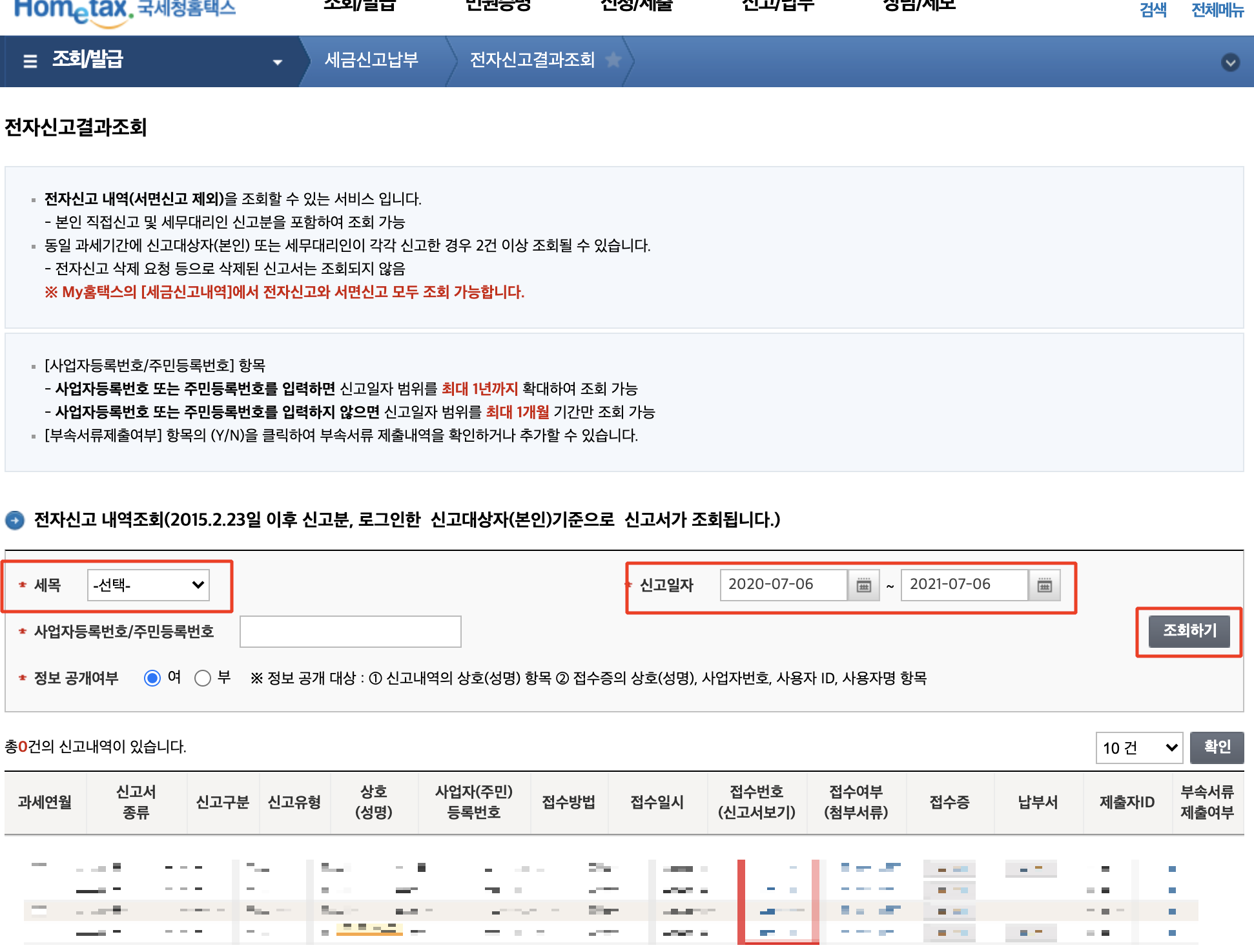 그러면 하단부에 신고내역이 조회될 것이다. 여기서 접수번호를 클릭하여 신고서 보기가 가능하다.