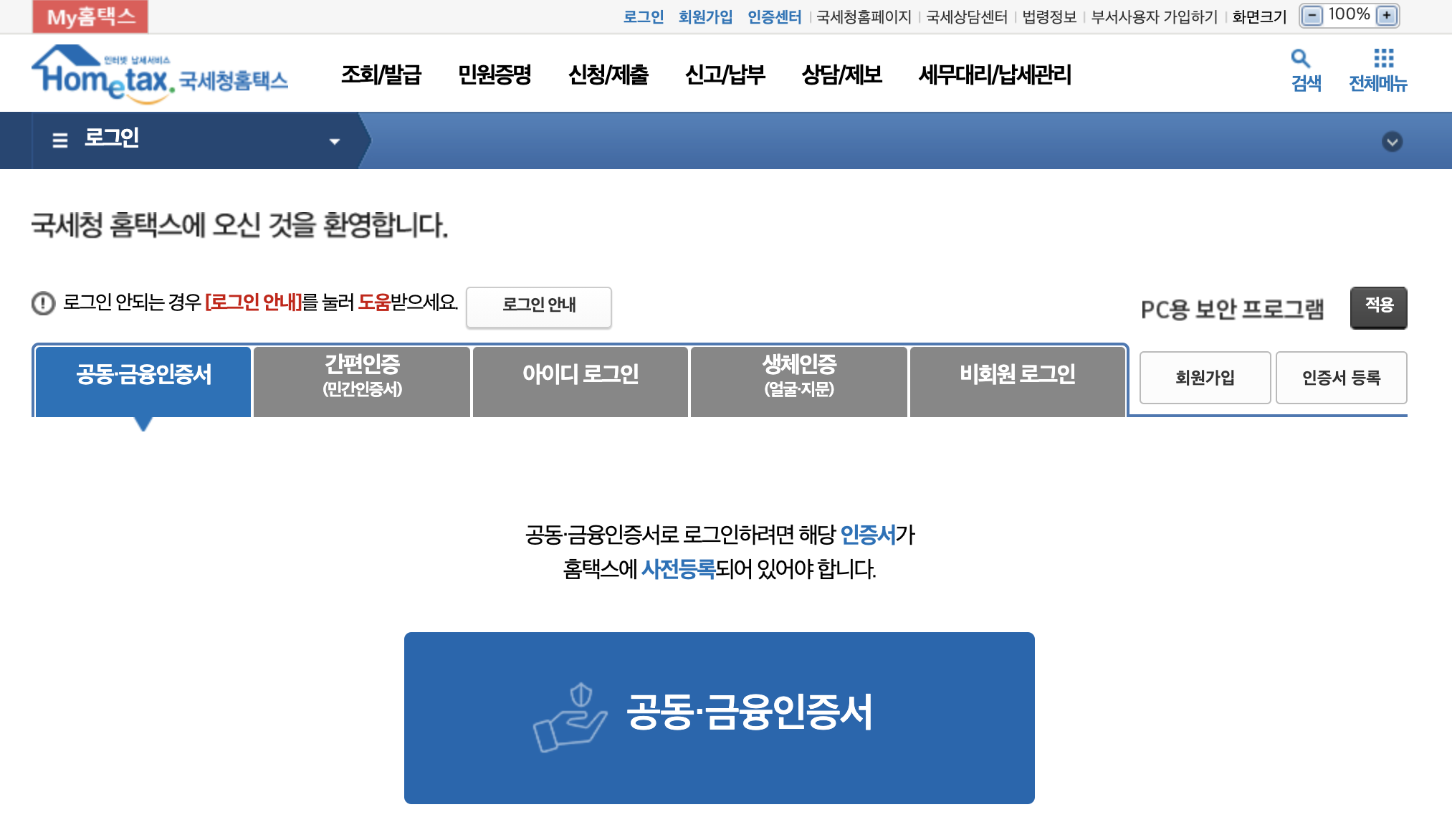 홈택스 접속 후 '인증서 로그인'이 필요하다. 만일 등록된 인증서가 없다면 인증서 등록을 하자.