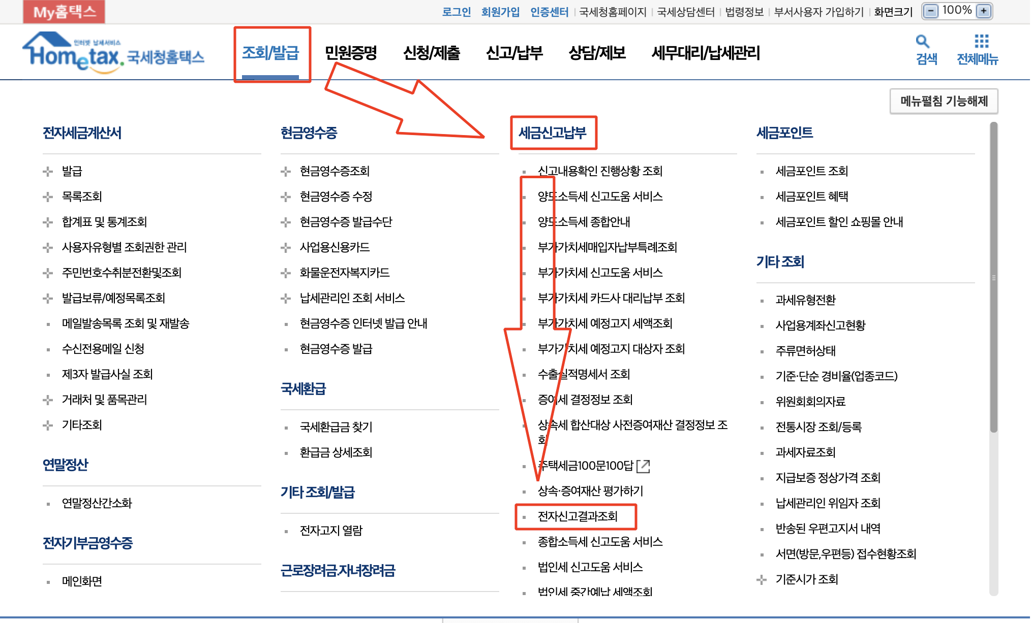 로그인 후 조회/발급 > 세금신고납부 > 전자신고결과조회 메뉴로 이동하자.