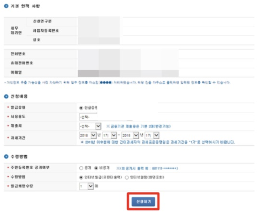 발급 유형은 국내의 경우 한글증명을 선택하고 용도/제출처/과세기간을 선택한다.
