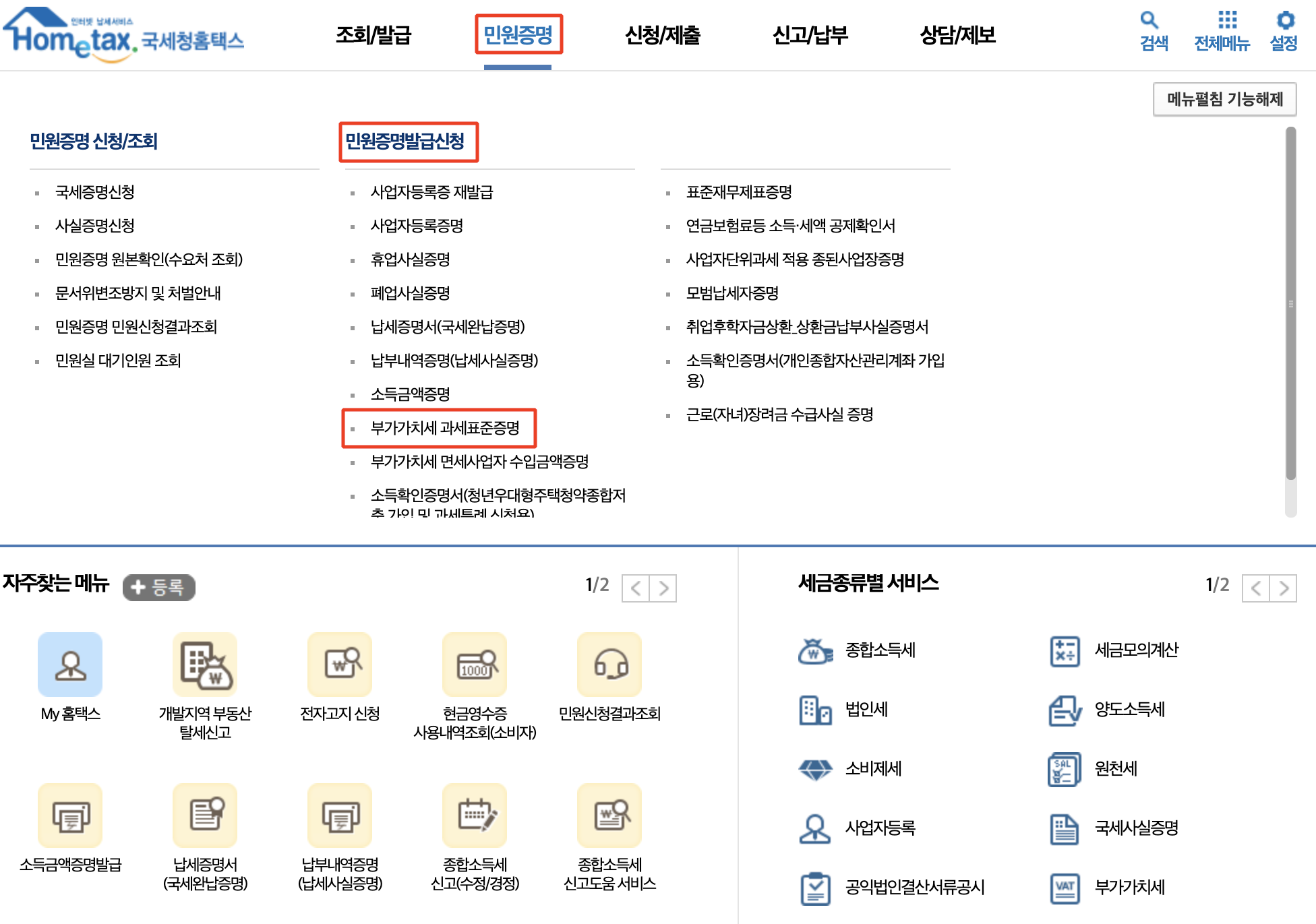 민원증명 > 민원증명 발급신청 > 부가가치세 과세표준증명 선택