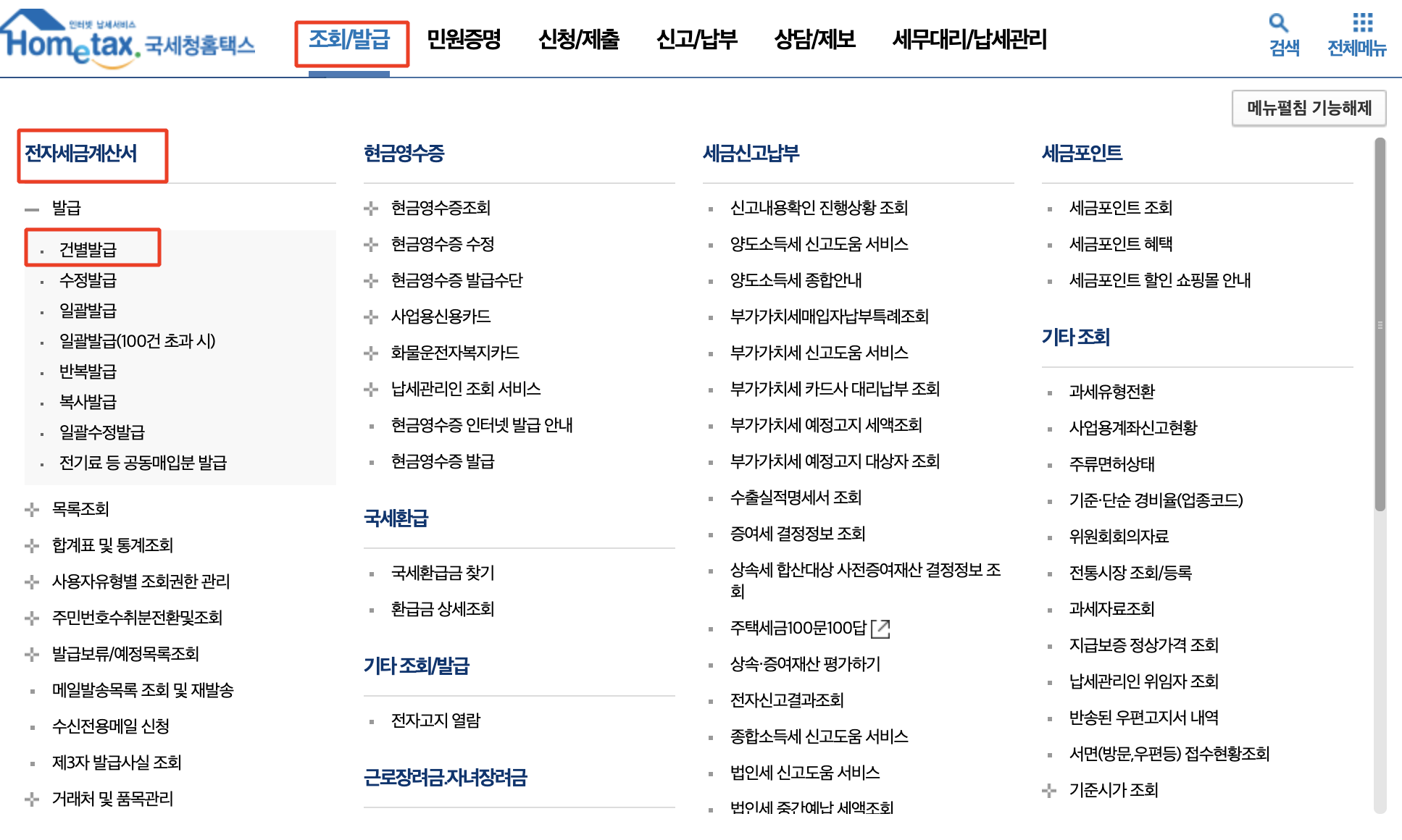 전자세금계산서 발급 메뉴로 이동하여 세금계산서를 발급받도록 하자.