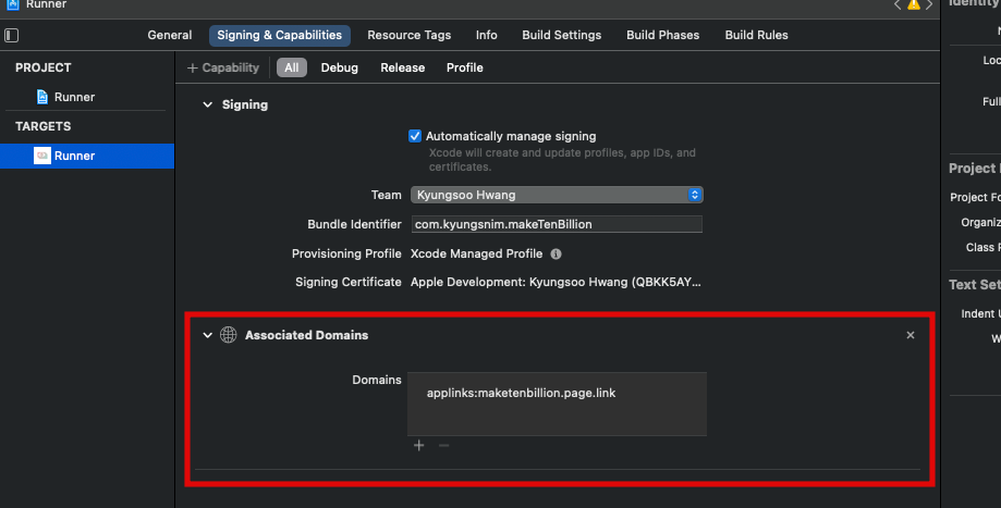 1. Xcode에서 프로젝트 열기 > Signing & Capabilities > Associated Domains 추가