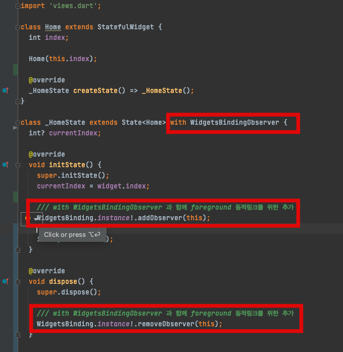 /// with WidgetsBindingObserver 과 함께 foreground 동적링크를 위한 추가