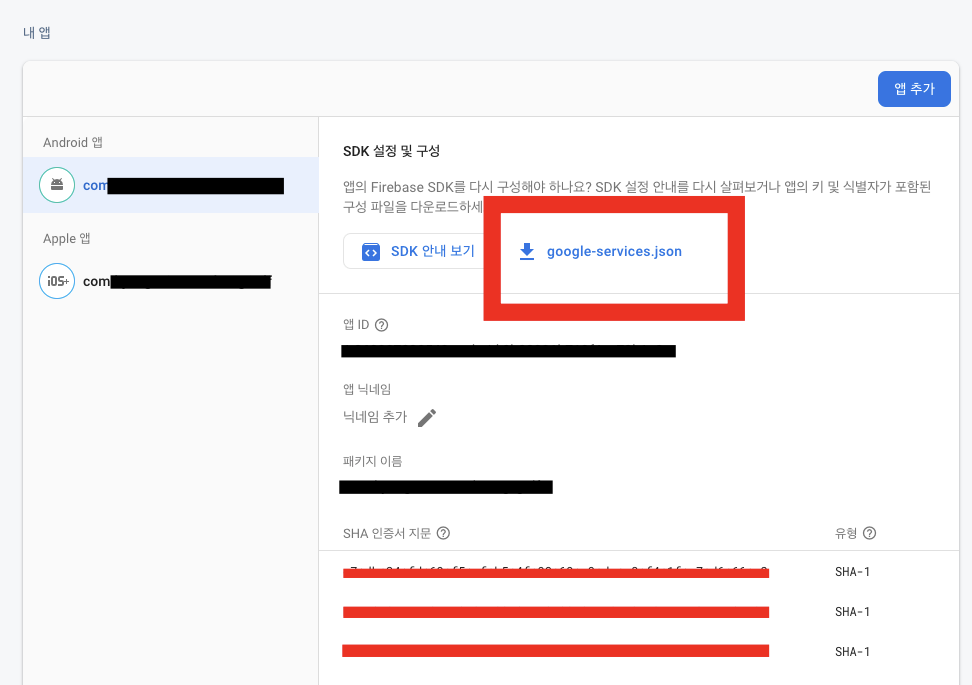 이제 얻은 해시키를 위에서 추가했던 Firebase 프로젝트 설정 > 일반 > 내 앱 > 인증서 지문에 추가해주고 새로 google-services.json 파일을 내려받고 Flutter 프로젝트 > android > app 폴더 하위에 새로 덮어씌우면 적용이 완료될 것이다.