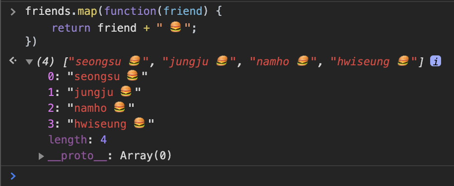 햄버거를 좋아하는 내 친구들 이름에 문자열도 붙일 수 있다. (이건 javascript로 표현)