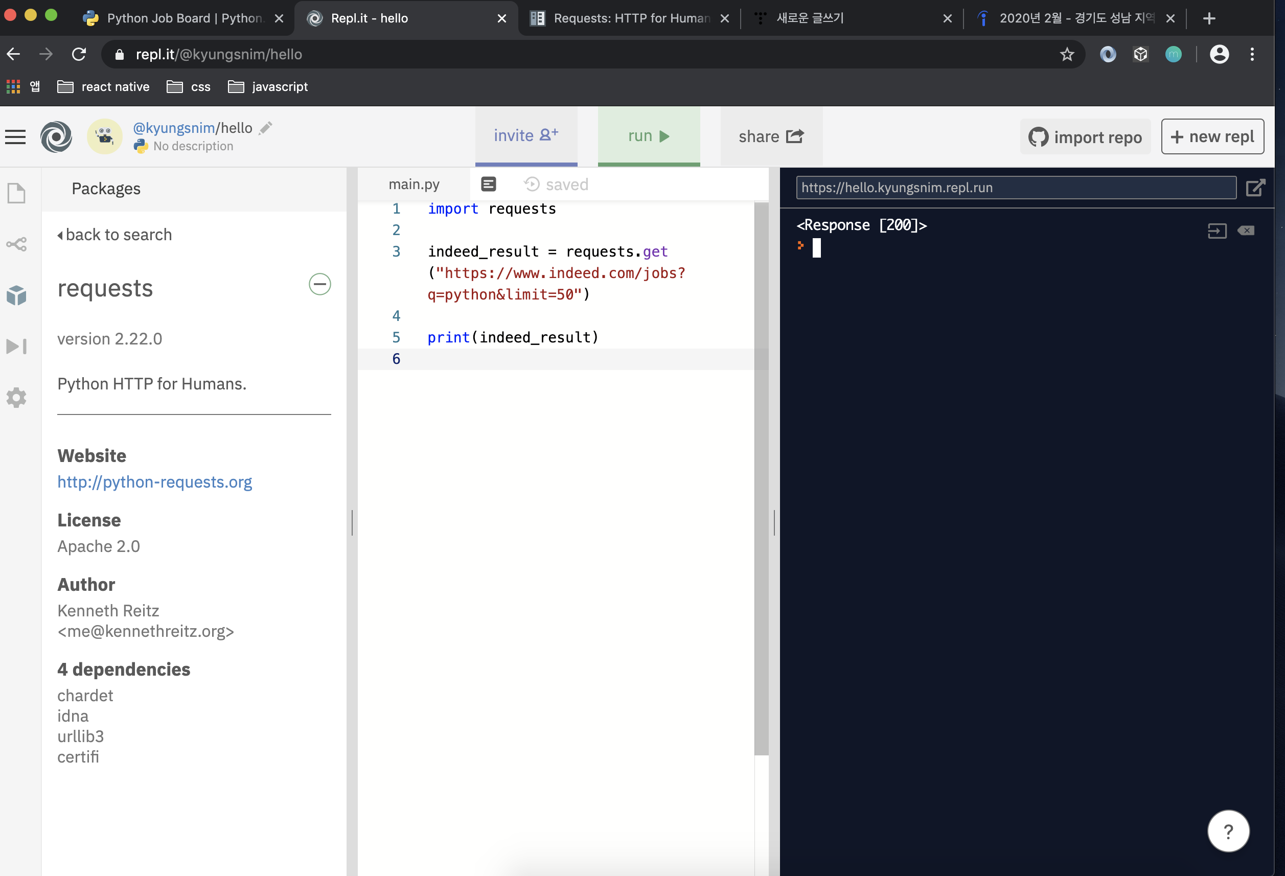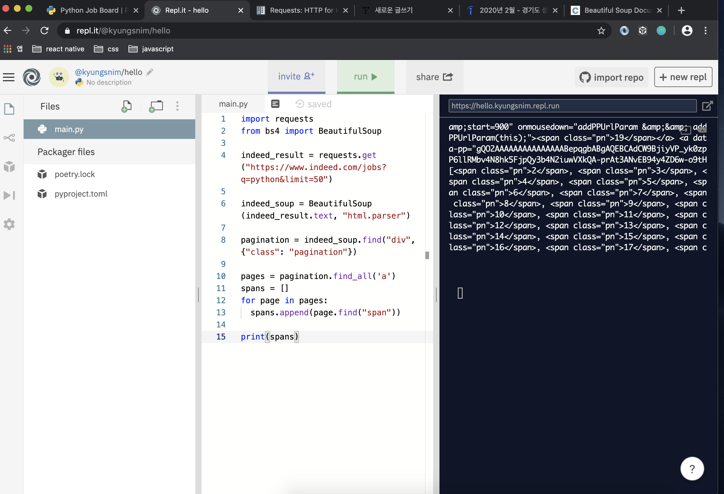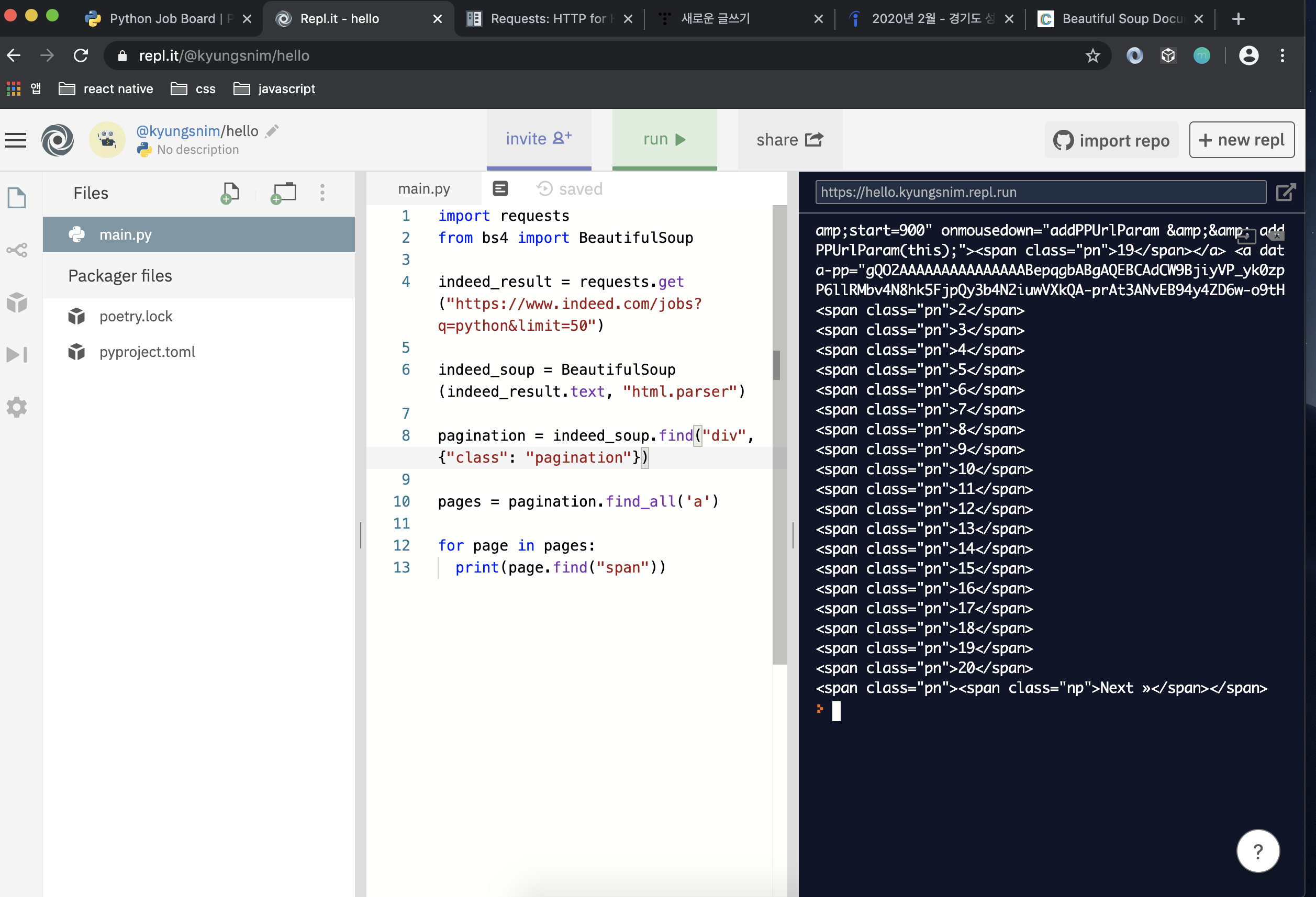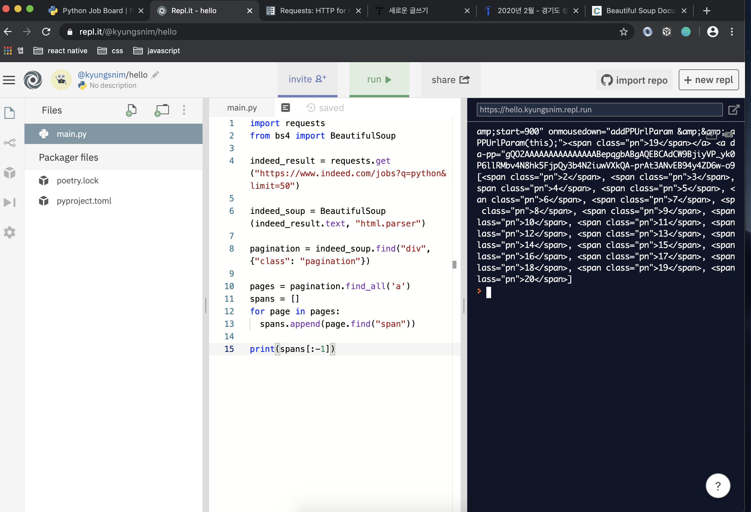 - python을 이용해 indeed와 stackoverflow에 접속 (전체 페이지 수 세기)