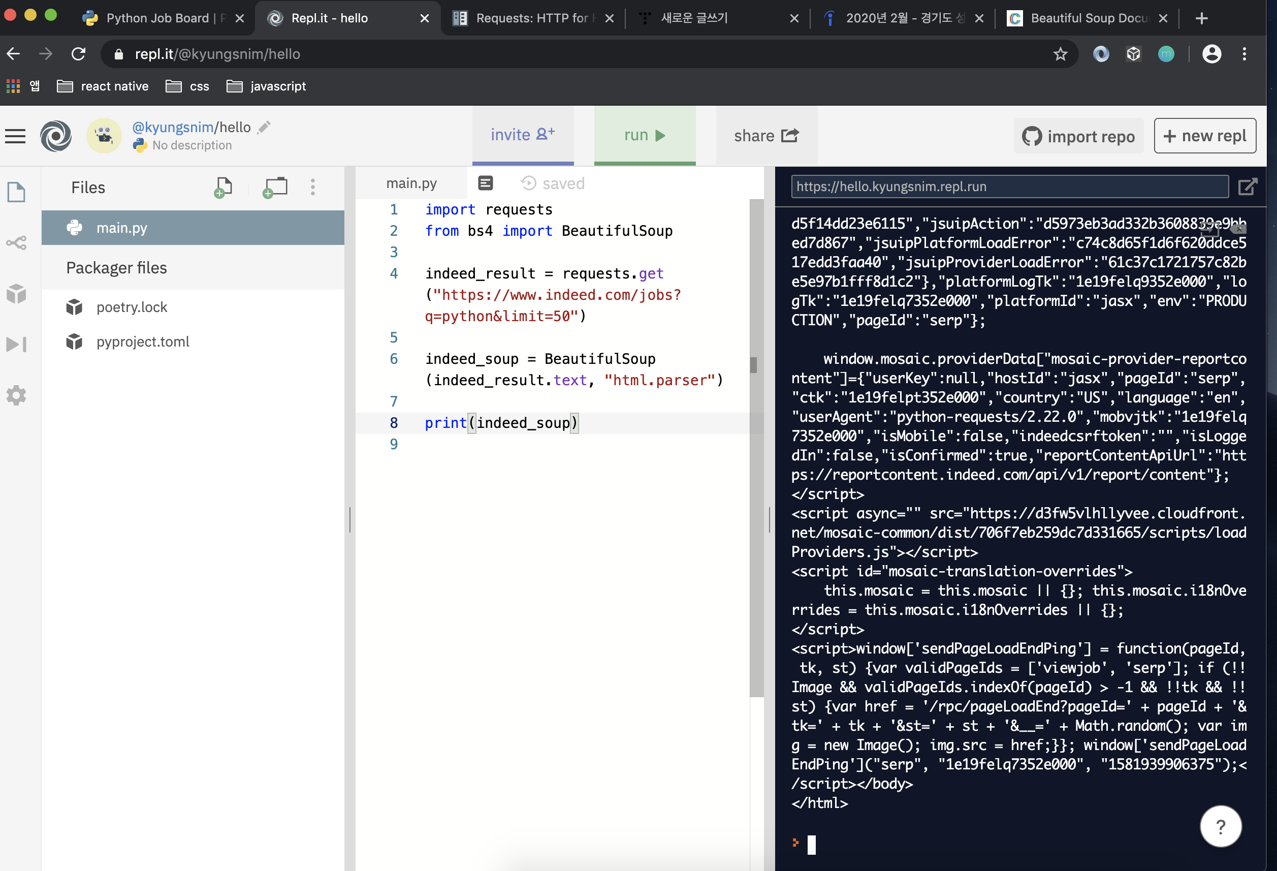 * 현재 indeed_result.text에는 해당페이지 전체의 html을 담고 있다.