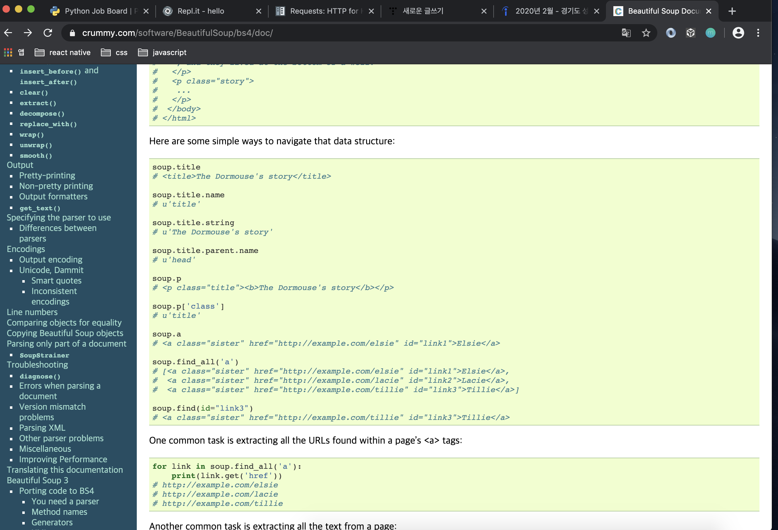 * 우리는 페이지수를 가져와야 한다. (beautifulsoup을 이용해보자 - 문법은 beautifulsoup quick start 참고하면 됨)